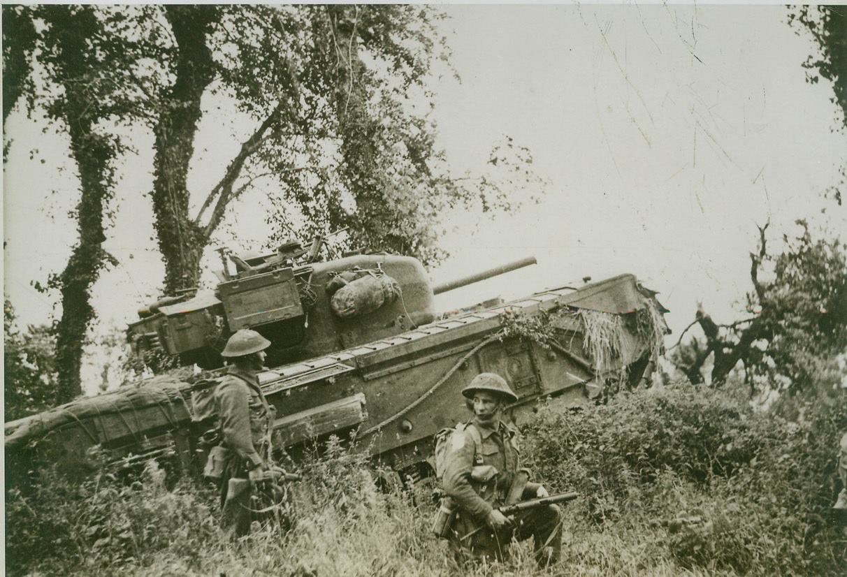 British Move Forward In Caen Sector, 7/4/1944. Caen, France—A lumbering Churchill tank crashes through a hedge at the side of a field, where British troops wait to follow under cover of the armored vehicle. Today (July 4) British and Canadian forces captured Carpiquet, only 3 miles west of Caen, and endangered German troops holding a semi-circular line north of the town. Credit: British official photo from ACME;