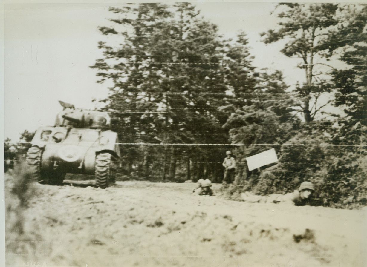 Allies Advance Under Nazi Gunfire, 7/10/1944. France—Crawling slowly along a hedge, two Allied infantrymen advance under Nazi gunfire near St. Jores, France. Tank at left rolls forward to engage the enemy in battle. Photographer inches ahead of advancing troops to make this dramatic picture. Credit: Signal Corps radiotelephoto from ACME;