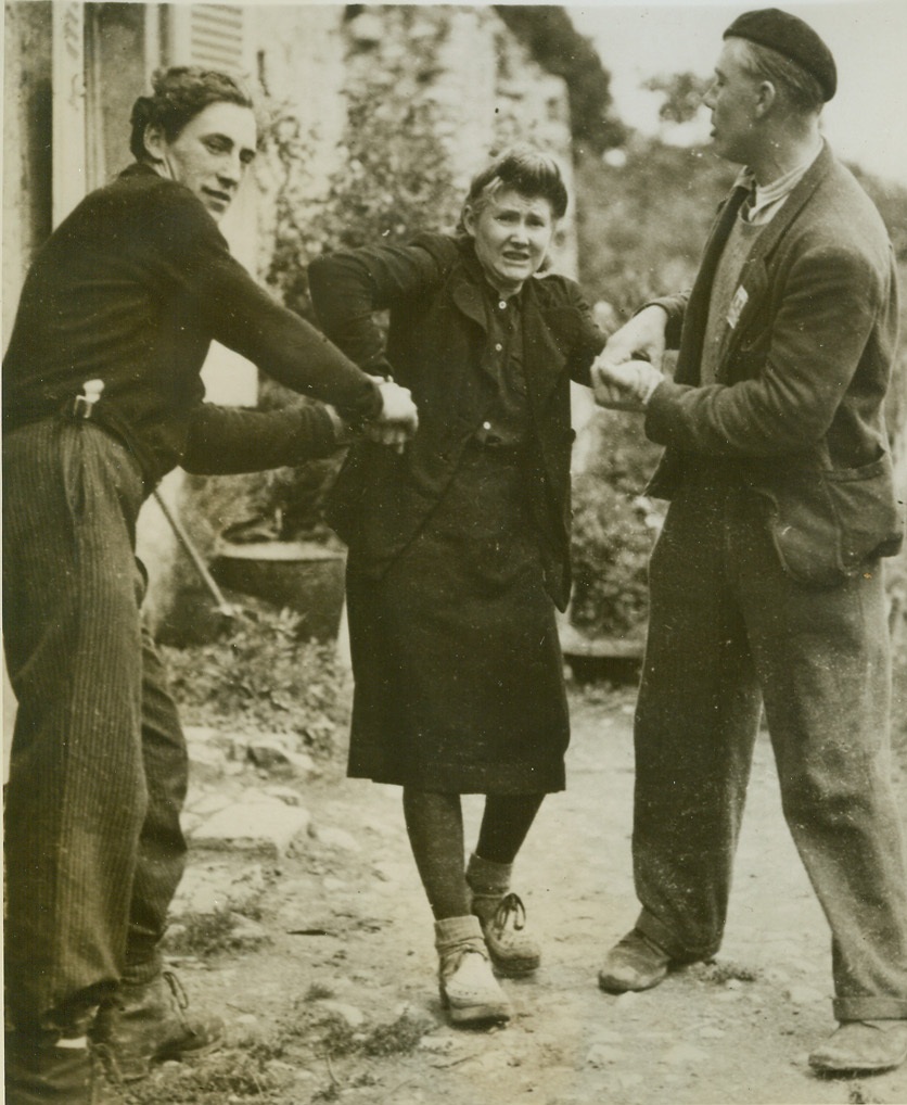 Punishment to Fit The Crime, 7/10/1944. France—Now that Allied forces have come, at last, and freed sections of enslaved France, French patriots are weeding out the quislings in their midst. Meting out punishment to fit the crime, they have set a particularly appropriate price for women collaborationists to pay. Going from house to house, the patriots seize female traitors, drag them to the street and put the scissors to their hair. Blonde Grande Guilotte, 23-year old French girl, was one of those shorn of her “crowning glory.” She is shown as patriots nabbed her. Credit: ACME;