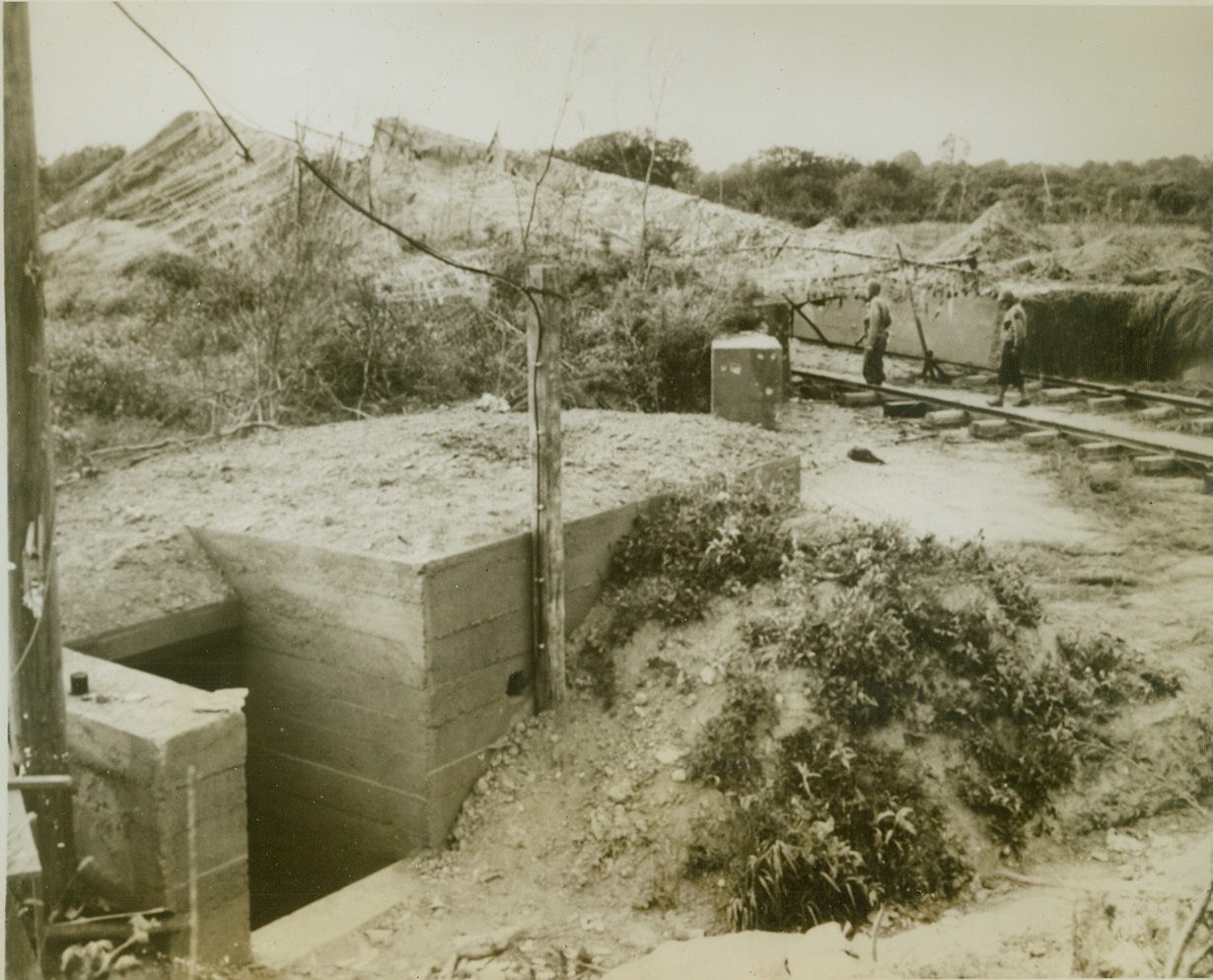 Yanks Take Launching Site, 7/2/1944. Delassy, France—A pair of American soldiers examine one of the robot bomb launching sites captured by our forces in France. This launching platform, not far from the town of Delassy, is reinforced with concrete and camouflaged. Credit: ACME;