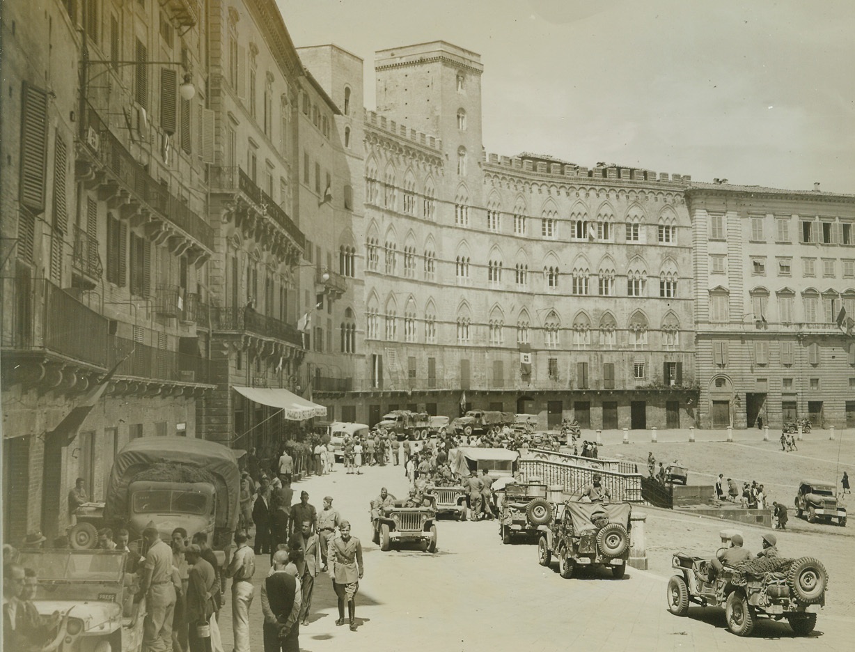 ALLIED TROOPS ENTER SIENA, 7/9/1944. ITALY—Jeeps roll through the street in the town square of historic Siena, one of the foremost art centers in Italy and the most perfectly preserved of the medieval cities on the Italian peninsula. Town was taken by French troops of the Fifth Army placing Allied forces only 25 miles from Florence. Note that the square is devoid of damage. Proof the the rapidity with which the Nazis are fleeing before the might of Allied forces in Italy. Bitter fighting is now raging in the rolling hills above Siena. Credit: Acme photo by Charles Seawood, War Pool Correspondent;