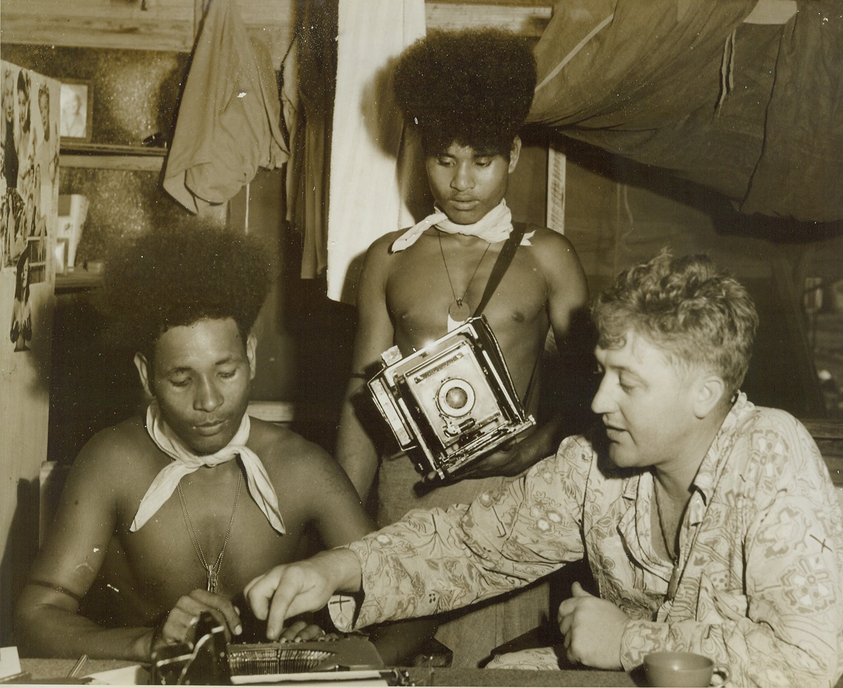 ACME Photo Turned New Guinea Prof., 7/14/1944. Port Moresby, New Guinea – ACME Newspictures War Correspondent, Frank Prist, Jr. seems to be in fairly good shape for secretaries at his office in Port Moresby, New Guinea. To make sure that his native help know the workings of American machines he is well prepared, and qualified, to turn professor of typewriterology. As he teaches one of the boys where to punch the dollar sign on the keyboard, the other turns the tables on Prist and becomes cameraman for the occasion. By the way, that’s Prist on the extreme right.Credit: ACME photo by Frank Prist, Jr., War Pool Correspondent.;