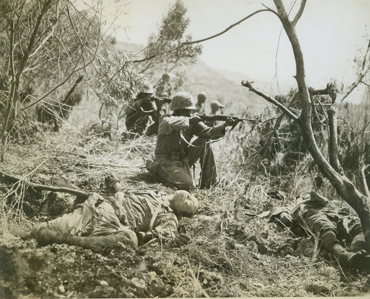 The Quick Heed not the Dead, 7/21/1944. Saipan – – Unmindful of the bodies of enemy soldiers lying close to them, Marine fighters kneel and take aim as they push ahead through Saipan. Members of the Second Marine Division, the warriors are making their way toward the Western beach below Mt. Marpi.;
