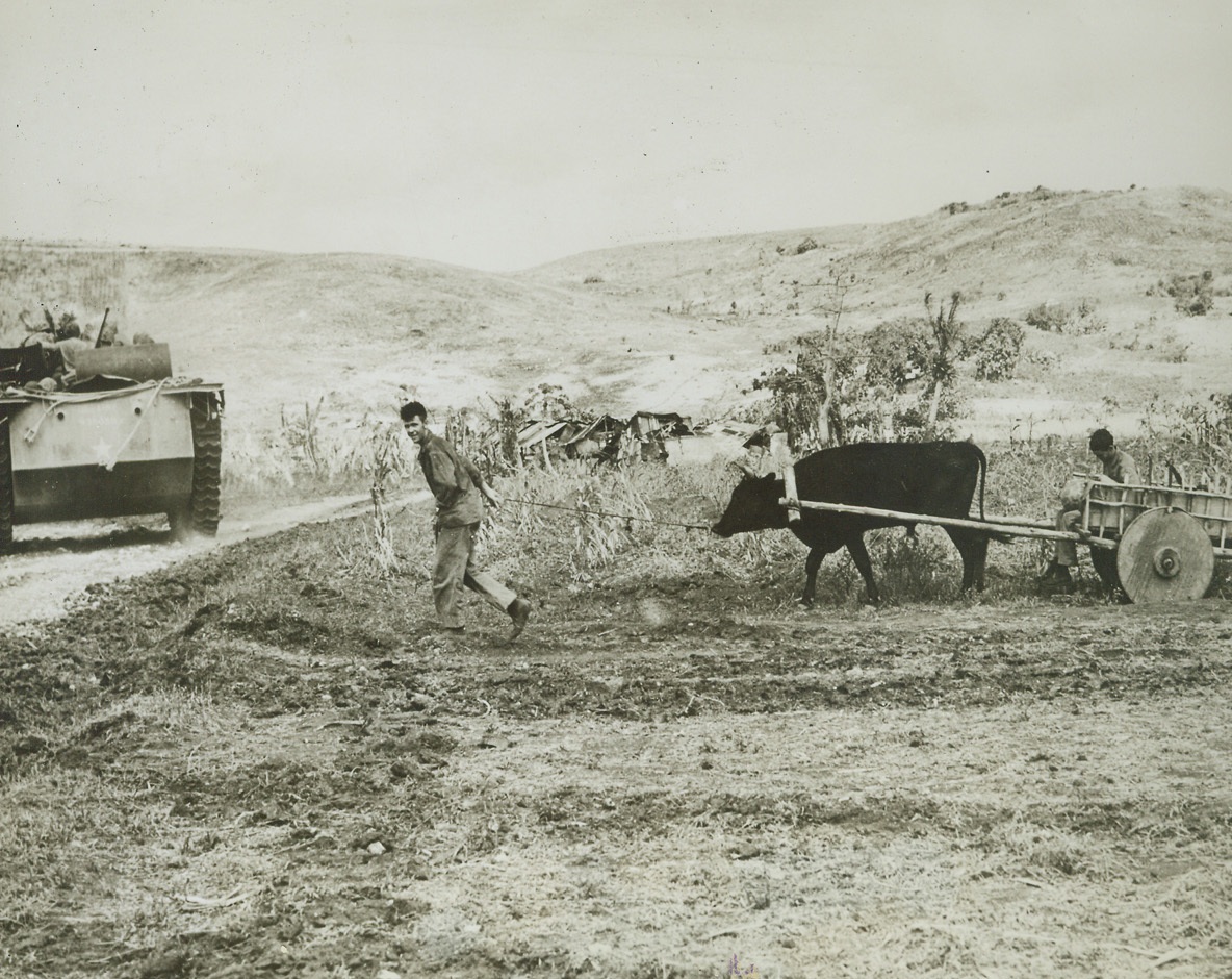 The Old and the New, 7/1/1944. Saipan—In marked contrast to scenes of death and destruction marking the bitter fighting on Saipan in which 9,752 American soldiers were killed, wounded or listed as missing in action, is this peaceful scene showing two modes of transportation over a thousand years apart. Marines in amphibious tractor at left are hauling supplies to front lines while two Leathernecks commandeer a Jap ox cart to move some of their equipment forward.Credit (Marine Corps photo from ACME);