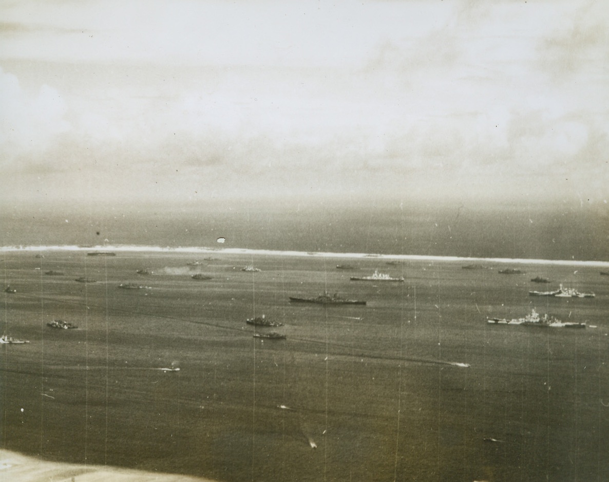 RECEIPE FOR JAP NIGHTMARE, 7/8/1944. PACIFIC—Packing the world’s most powerful punch a huge Navy Task Force lies at anchor in a Pacific harbor before going out on another assignment of Japanese destruction. Even as this caption is being written, the armada—battleships, cruisers, flat tops and destroyers—might be sailing in force to meet what is left of the Jap fleet somewhere in the Pacific. On its last mission this force, or one as powerful, came within 500 miles of the Nipponese capital. See ACME photo #W 729678 for another dramatic scene of the ships that are giving the Japs their biggest nightmare. Credit: U.S. NAVY PHOTO FROM ACME.;