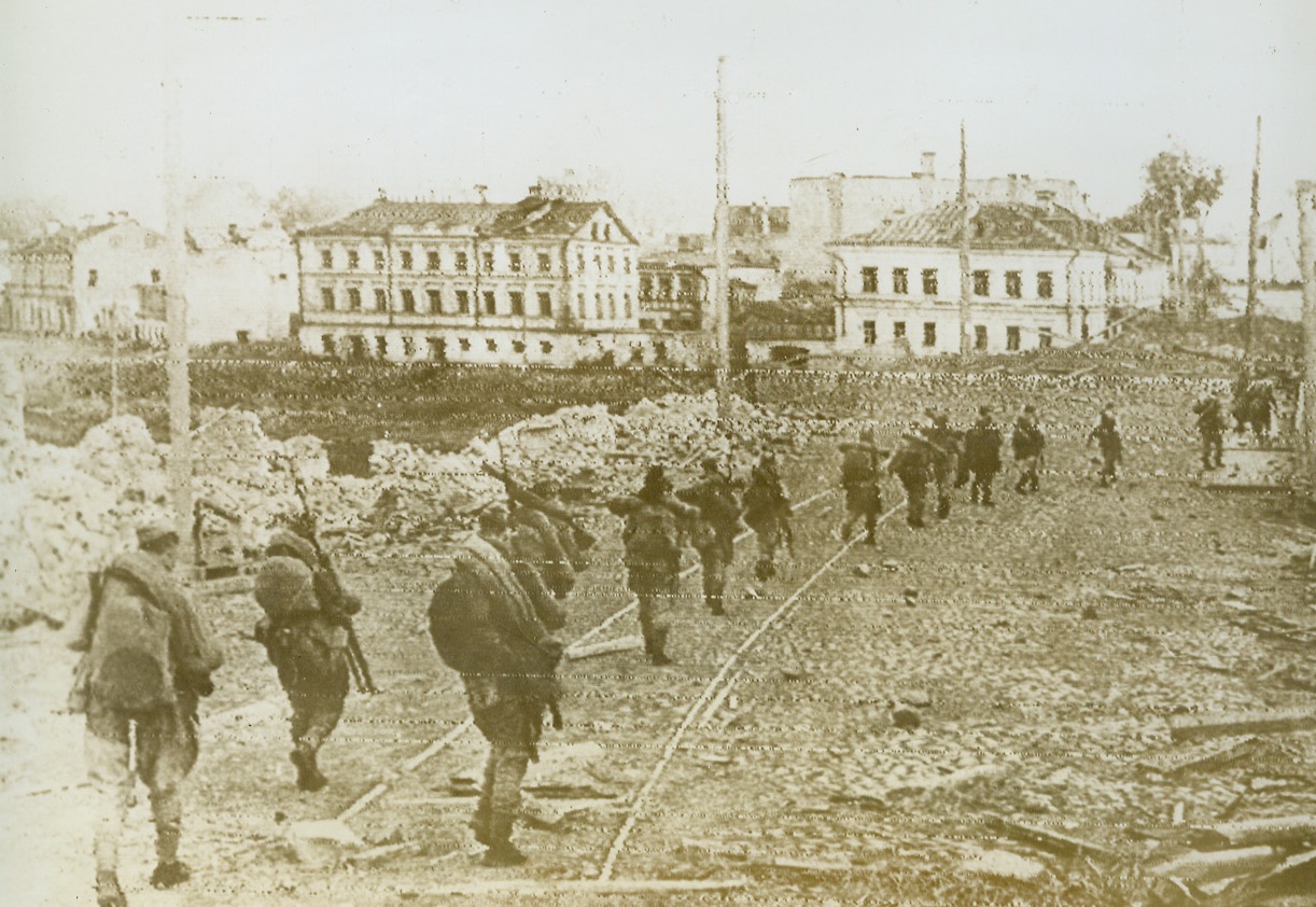 Soviet Infantry on the March, 7/25/1944. PSKOV, POLAND—Soviet infantrymen pass through a street in Pskov after fleeing Germans demolished the town. The Russian Army is now less than 50 miles from Warsaw, the Polish capitol. Credit: ACME Radiophoto;