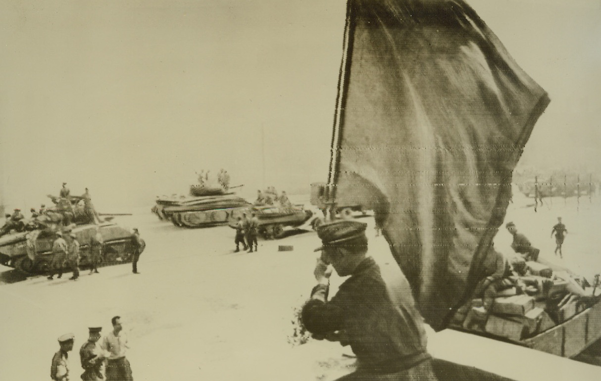Make Way for Allied Supplies!, 7/3/1944. CIVITAVECCHIA, ITALY—Smoke rises above the harbor at Civitavecchia after American troops blew up a beached ship with a hearty dose of TNT. The ship was blocking the harbor entrance and preventing LST’s to land with supplies. Allied troops are steadily advancing toward the Pisa-Rimini Line, with French Forces with the 5th Army capturing the historic city of Siena, and Americans advancing past Cecina toward Leghorn. Credit: ACME;