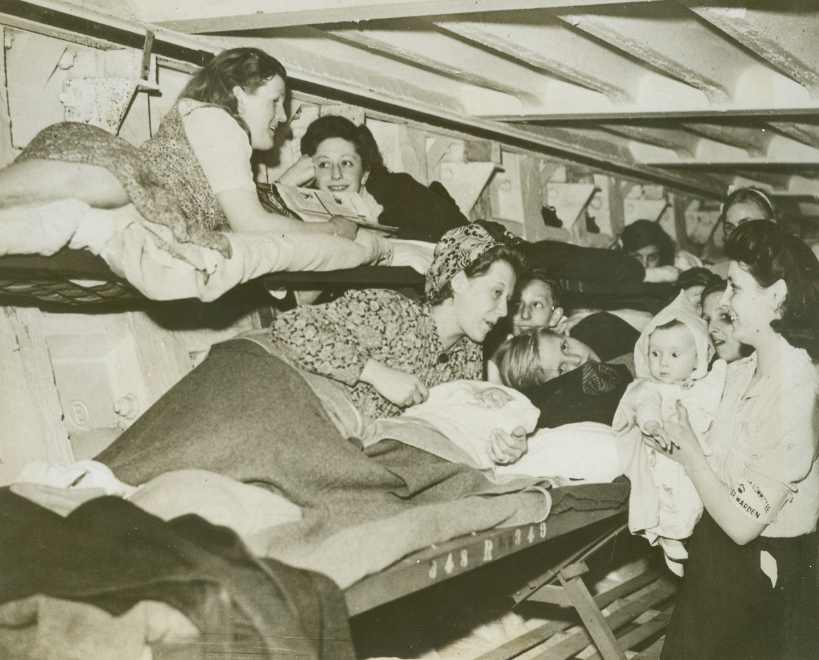 New Deep Shelter Against “Buzz Bombs”, 7/27/1944. London, Eng. – TO allow Londoners protection and to give them some opportunity to sleep while the city is under bombardment by German robot “buzz-bombs”, the first of a series of deep shelters has been opened. These new shelters consist of two main twin tunnels running beneath existing tube railway (subway) lines. They are divided into 16 sections each fitted with bunks for 500 persons. Cross-passages connecting the two tubes contain first aid posts, lavatories and machinery control rooms. Bunks fold against the walls when not in use to allow free passage of traffic. Four canteens are provided at suitable points, run by volunteer organizations. The shelters are controlled and administered by commissioners for the London Civil Defense Region. Each shelter is in charge of a shelter superintendent, with a nucleus staff of full-time wardens, supplemented by volunteer wardens. In one of the sections of the new deep shelter, Londoners lie in the double row of bunks, at the right, a warden holds a child. Credit ACME;