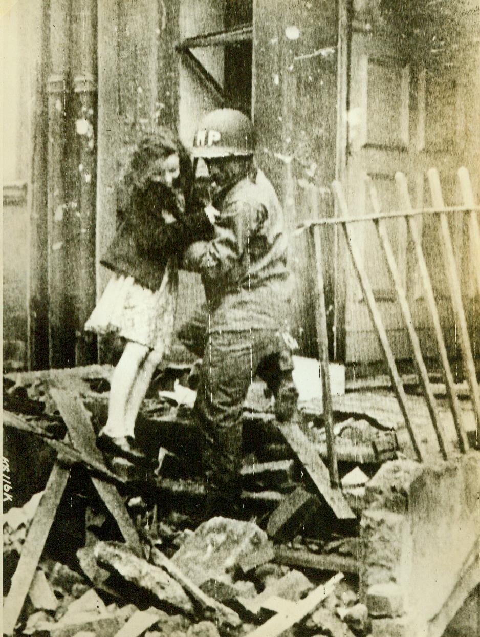 Yank Aids Flying Bomb Victim, 7/5/1944. ENGLAND – An American military policeman…lifts a young British girl out of her home which was hit by a Nazi flying bomb. Bombs, striking indiscriminately, have hit schools, hospitals and churches. Scene took place somewhere in England.;