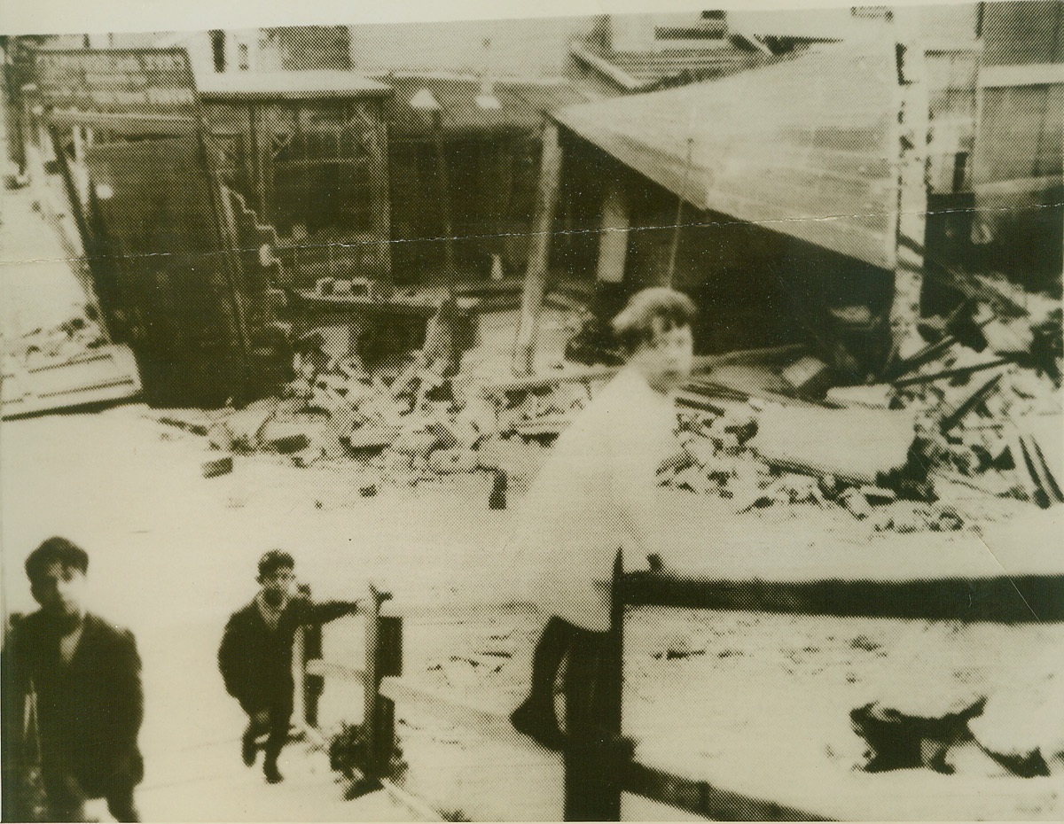 Children Play Amid Debris of Nazi Raid on Paris, 6/3/1940 Paris, France—Paris school children playing among the debris of a building wrecked in the Nazi bombing raid on Paris on June 3rd. French officials say that ten children were killed when a bomb struck a school. This picture, passed by the French censor, was flashed to New York from Paris by radio. Credit: ACME radiophoto;
