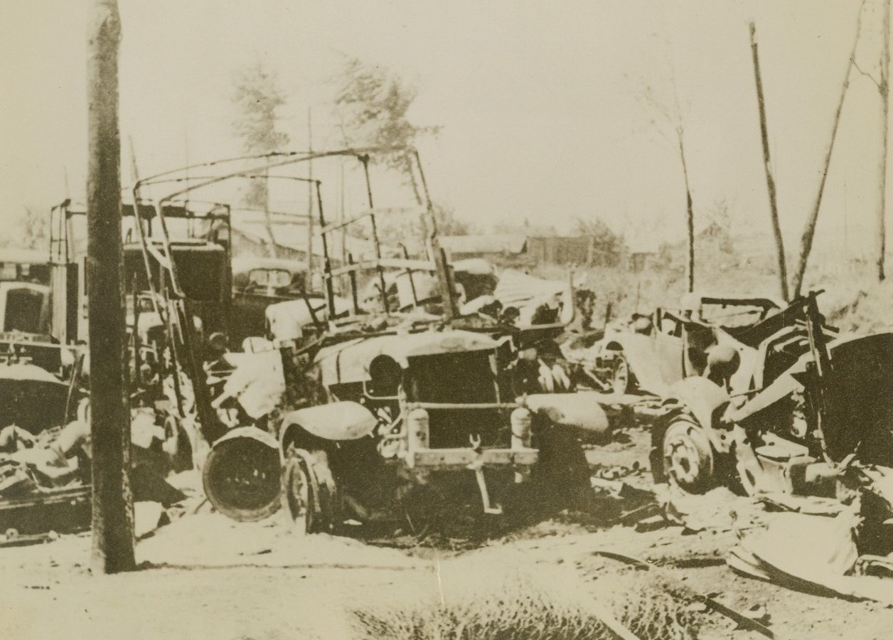 French Supply Column Bombed, 6/13/1940 FRANCE –Shattered wreckage of a French supply mechanized column, after destruction by German aerial bombardment near Peronne, according to Nazi-censored caption. Credit: Acme;