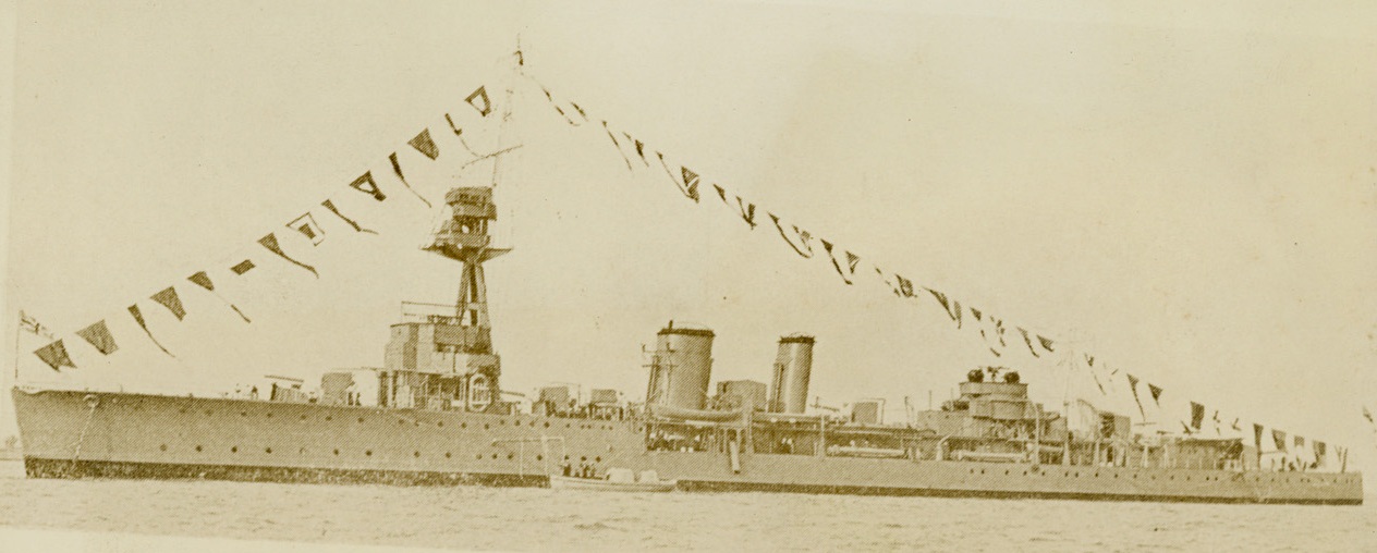 BRITISH CRUISER SUNK BY ITALIAN SUBMARINE, 6/15/1940 LONDON, ENG. – First British man o’ war to fall victim to Italy’s powerful submarine fleet, was the cruiser Calypso, 4, 180-ton warcraft shown above, An announcement by the British admiralty disclosed today, (June 15). The cruiser, built in 1917 and refitted in 1929, was sunk in the Mediterranean. It’s normal complement was more than 400 officers and men. Credit: Acme;