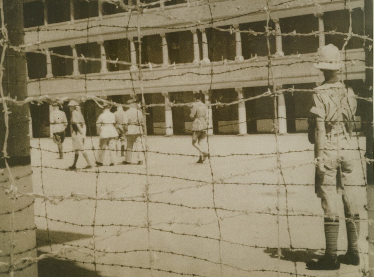 Italians in British Prison Camp, 7/11/1940 Egypt—Italian officers, among the first prisoners taken in fighting on the Eastern front, walking inside the barbed-wire enclosure of a British prison camp in Egypt.Credit: ACME.;