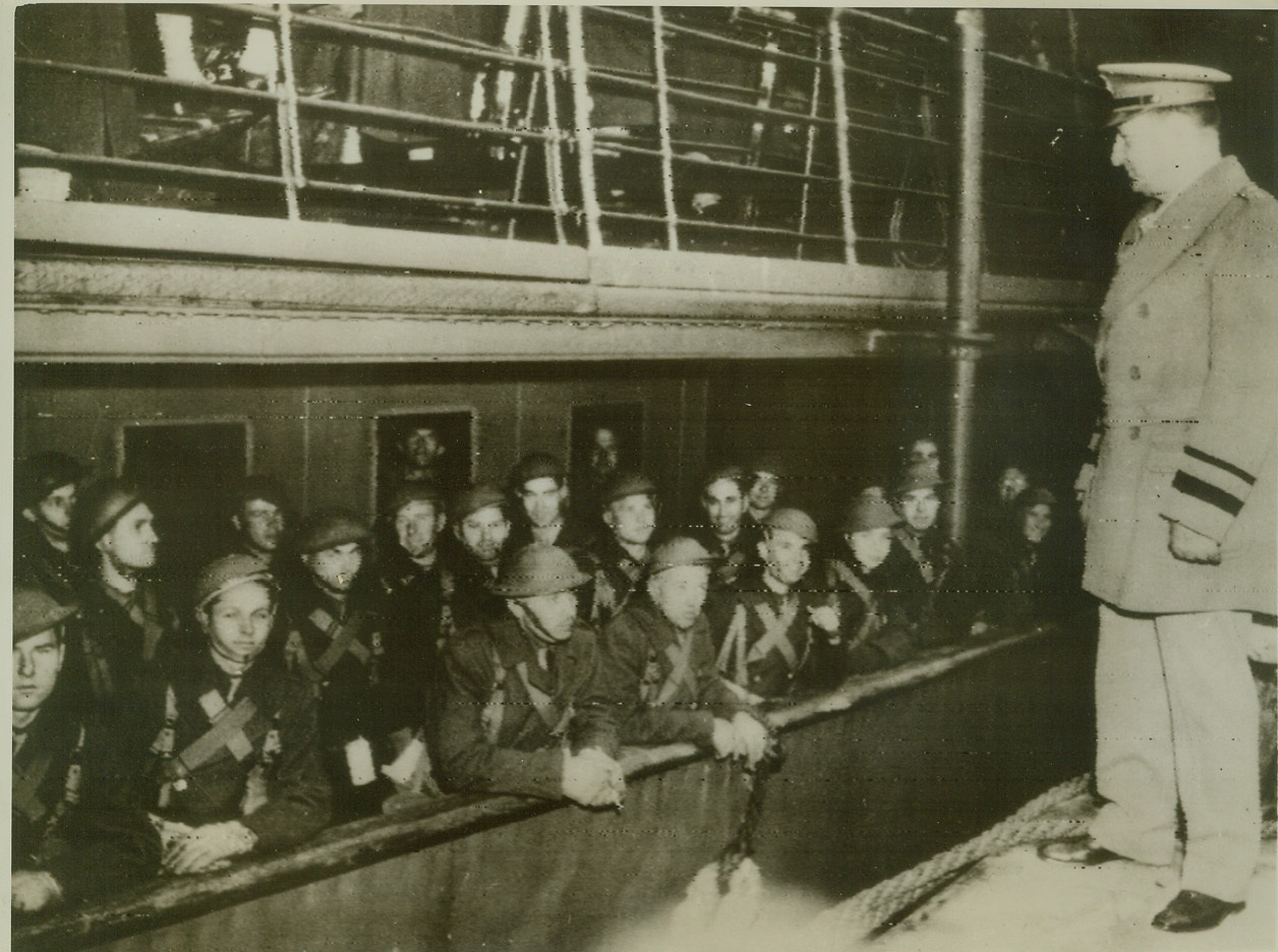 LOOK WEST, ADOLF, 5/18/1942. WITH AEF IN IRELAND – Maj. Gen. Russell P. Hartle, (right) Commander of A.E.F. in Northern Ireland, is shown greeting soldiers of a huge A.E.F. who arrived at a North Irish port in a large convoy – the largest seen anywhere during the entire war. Not a single ship was lost. Aboard the ships were tank units, guns, carriers, jeeps and trucks which took days to unload. Photo was radioed from London to New York today. Credit: OWI Radiophoto from ACME;