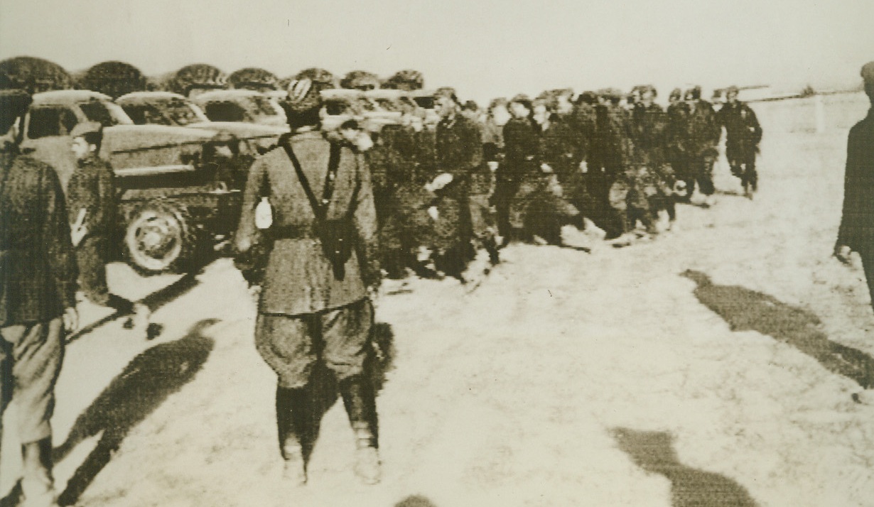 Long Trail of Defeat, 5/18/1942. RUSSIA – Just received from the Northwestern front is this picture showing a fresh batch of German war prisoners being marched off to the rear of the Soviet lines through deep snow.;