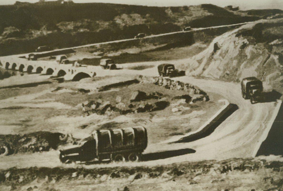 Speeding Supplies to Russian Ally, 5/14/1942. Lorries loaded with supplies from the United States and Great Britain are shown, in this photo radioed from London to New York today (May 14), in “convoy” as the trucks are rushed toward Russia. Over this new road, built with cooperation of government of Iran, the trucks travel for eight days en route to the Soviet Republics. Credit: ACME Radiophoto;