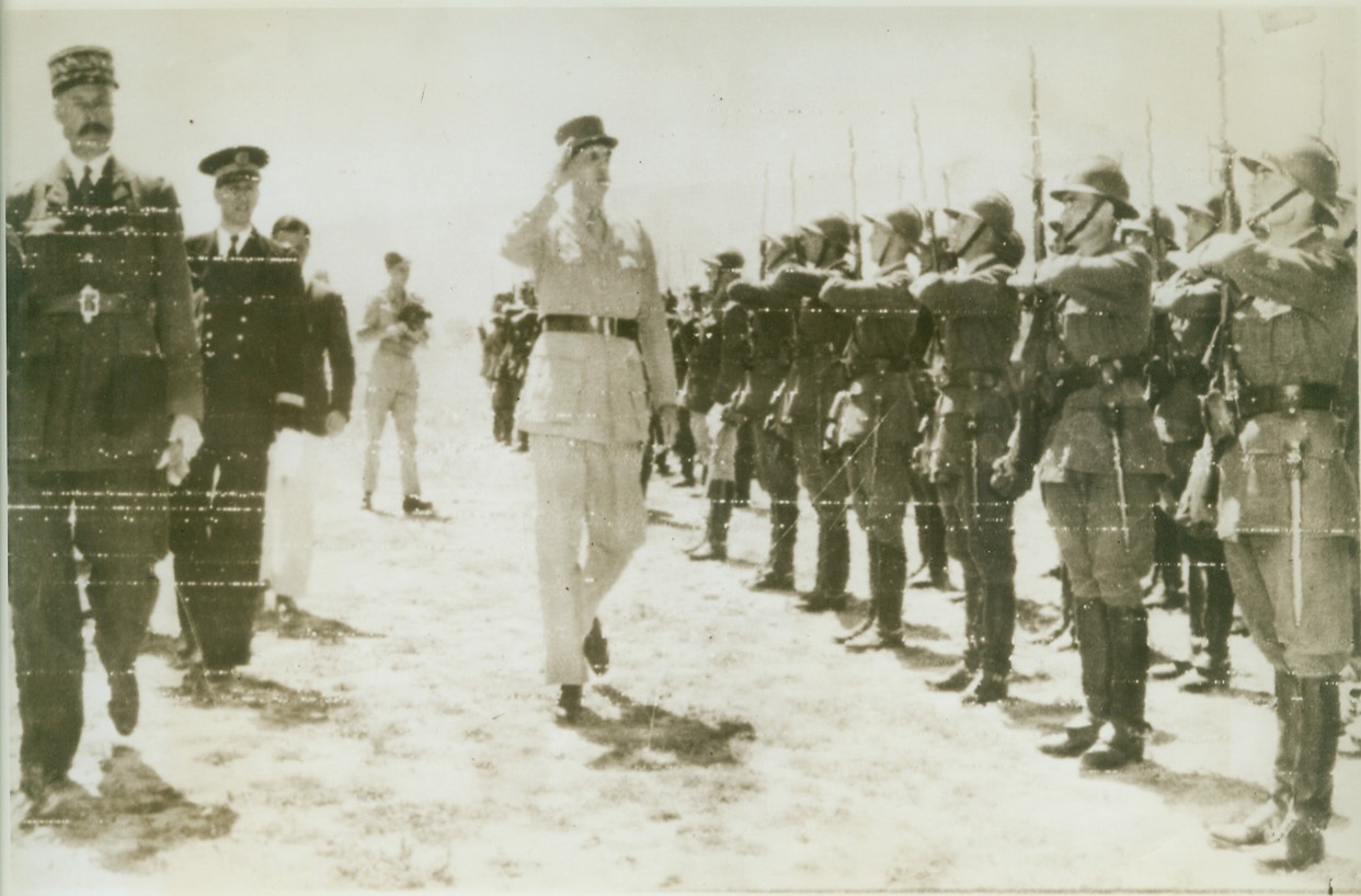 FIGHTING FRENCH HAIL DE GAULLE, 5/31/1943. ALGIERS, N. AFRICA – Just after his long awaited arrival in North Africa, General Charles De Gaulle (right) returns the salute of Fighting French soldiers as he leaves the airfield outside of Algiers with General Henri Giraud (left). Although Giraud made no announcement of the May 30th arrival of the Fighting French leader, Algerian crowds quickly discovered his presence and ignored bans on public demonstrations by shouting: “Vive De Gaulle.” Credit: OWI Radiophoto from ACME;