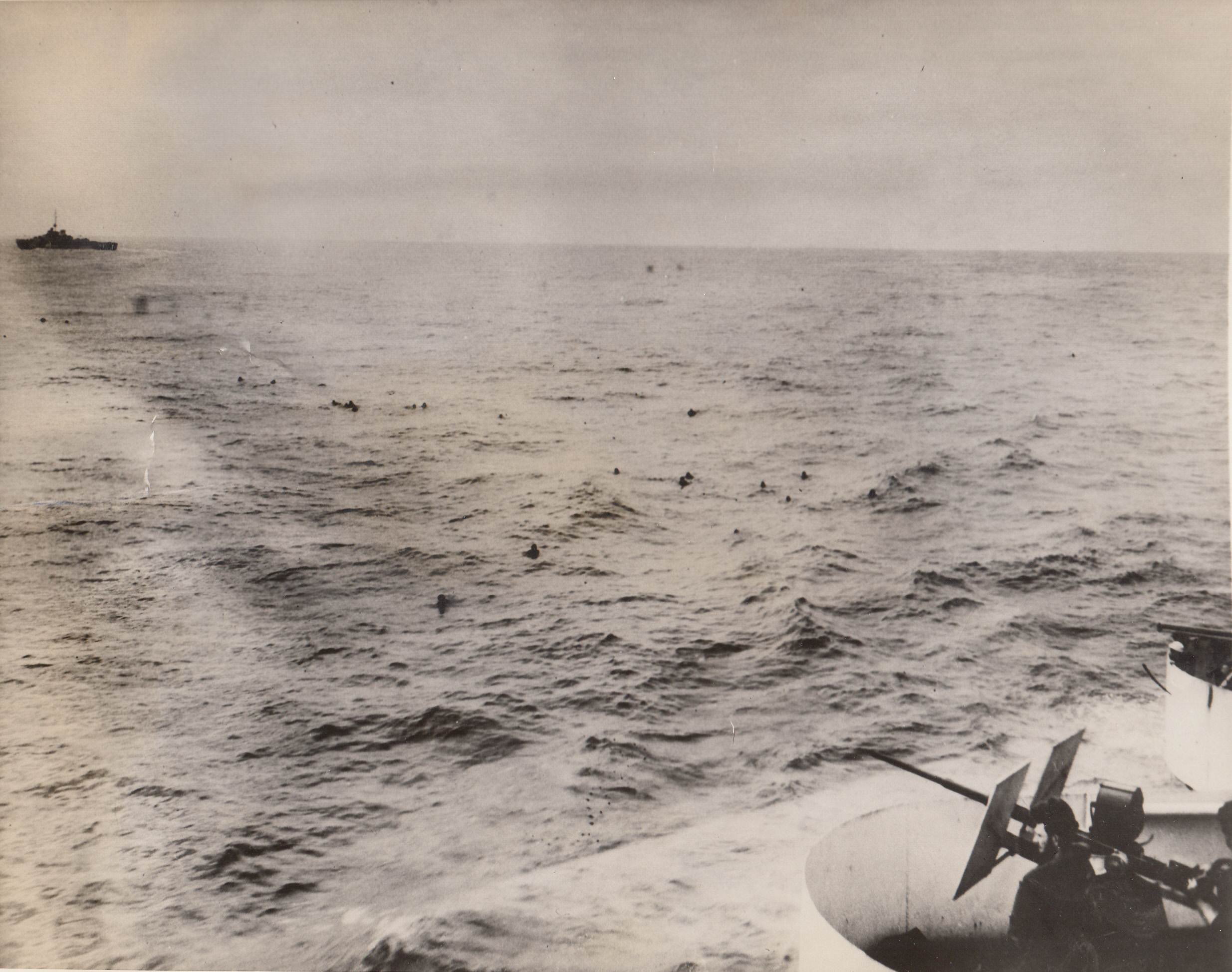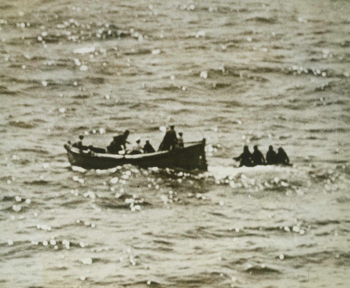 Subless Supermen, 5/31/1943. North Atlantic – “Oh where, oh where has that submarine gone” is the song of these Nazis as they paddle for their lives toward the U.S. Coast Guard cutter Spencer, which forced up and sank their undersea craft in a recent North Atlantic action. The U.S. Coast Guard Cutter Duane, which aided in the rescue, is shown in the background. The enemy sub was trying to sneak into the midst of a big convoy when the Spencer (right foreground) sent it to Davy Jones.;