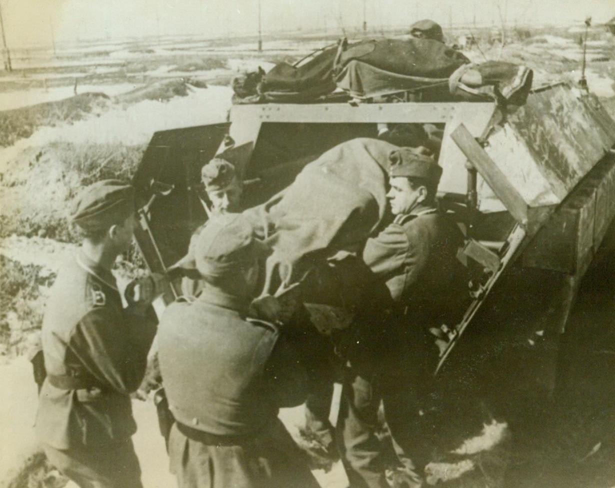 PLENTY OF BUSINESS FOR NAZI AMBULANCES, 5/21/1943. A wounded Nazi soldier is removed from an ambulance just back from a battlefield. Although the original German caption gave no location for this war scene, the snowy terrain indicates that it is somewhere on the Russian front. Photo arrived by clipper from London Credit Line (ACME);