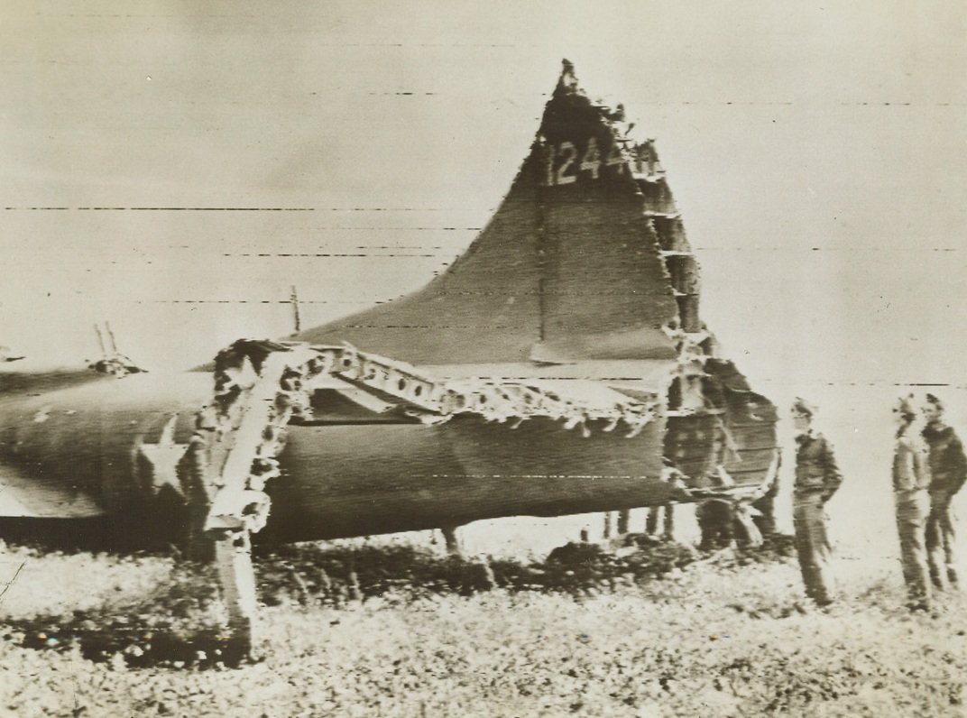 “Wounded” Warbird Comes Home, 5/21/1943. American fliers examine the battered tail section of an American Flying Fortress that managed to return to its home base in spite of damages that crippled it. The “wounded” warbird made its spectacular flight back after participating in a raid on Palermo, Sicily. Credit: U.S. SIGNAL CORPS RADIOTELEPHOTO-ACME.;
