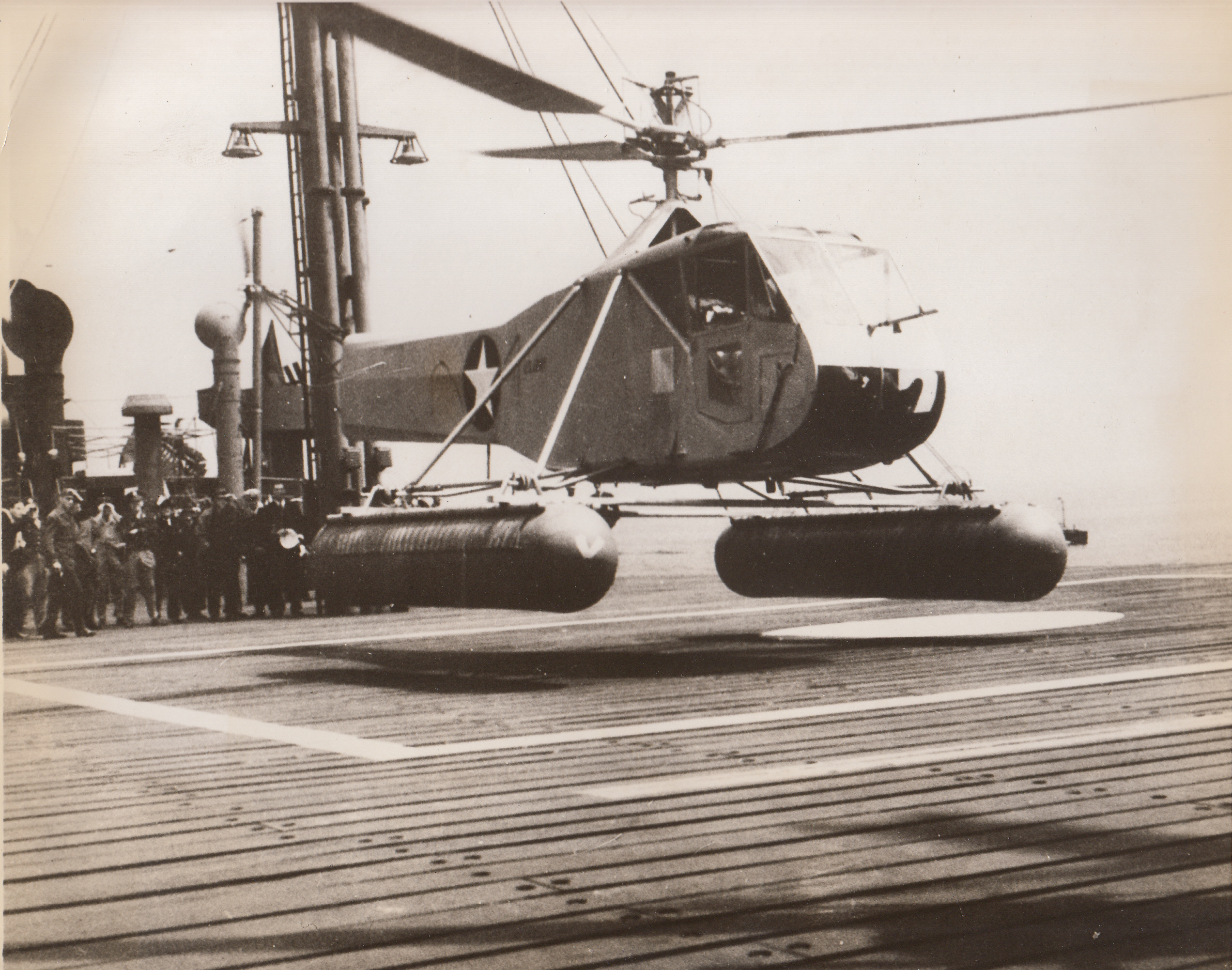 Helicopter Takes to the Ocean, 5/25/1943. A helicopter hovers over a small square marked off on the deck of a tanker, performing the tiny-space landing to prove its value as a sub fighter. In a recent demonstration on Long Island Sound, the wingless aircraft made 24 landings and take-offs from the small deck of a moving tanker. The craft, known as the Army Air Forces R-4 Helicopter, is an AAF development. A plan is in progress to install a small deck on Liberty ships to permit helicopters to be used at sea in anti-submarine duty.;