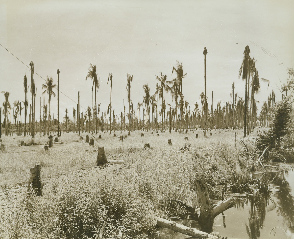 Battle Scars, 5/20/1943. New Guinea – – Although many months have passed since Jap and Allied troops fought here, time and fast-growing jungle vegetation have not yet been able to remove the scars of battle from this field in the Buna area of New Guinea. Naked, battle-scarred palms and jagged stumps still jut out from thick foliage to tell the story of the fury that raged here.Credit Line –WP- (ACME);