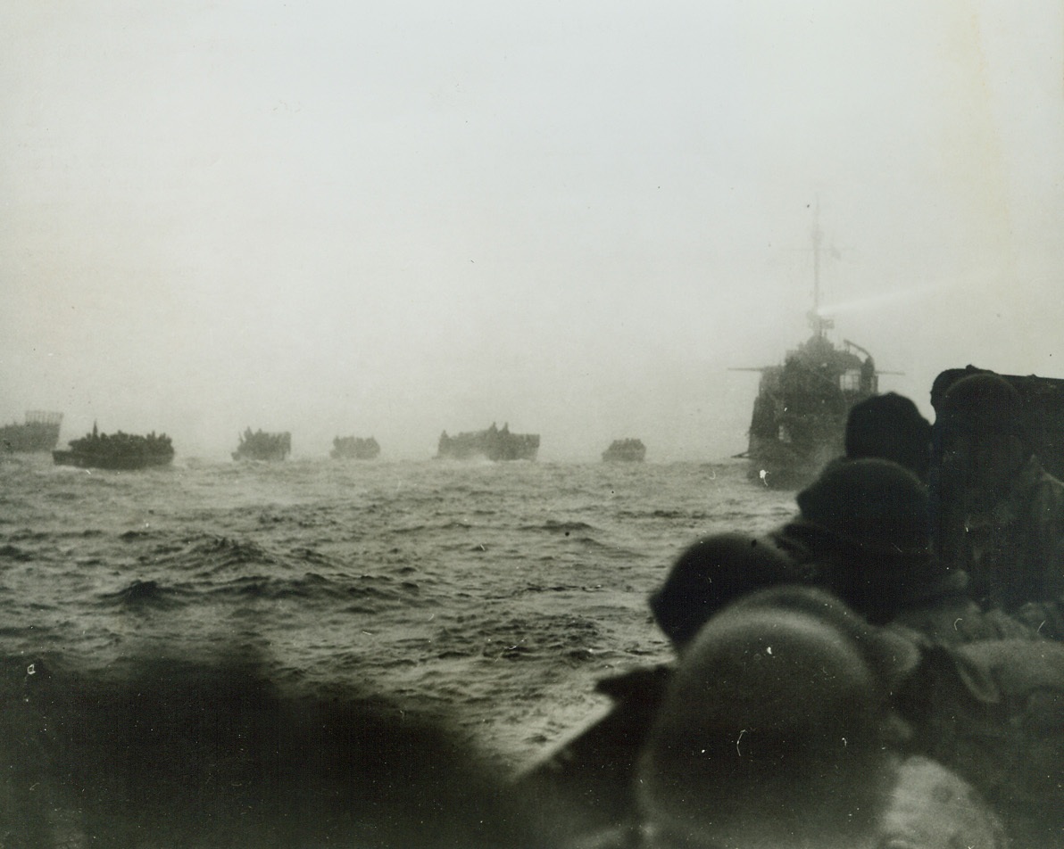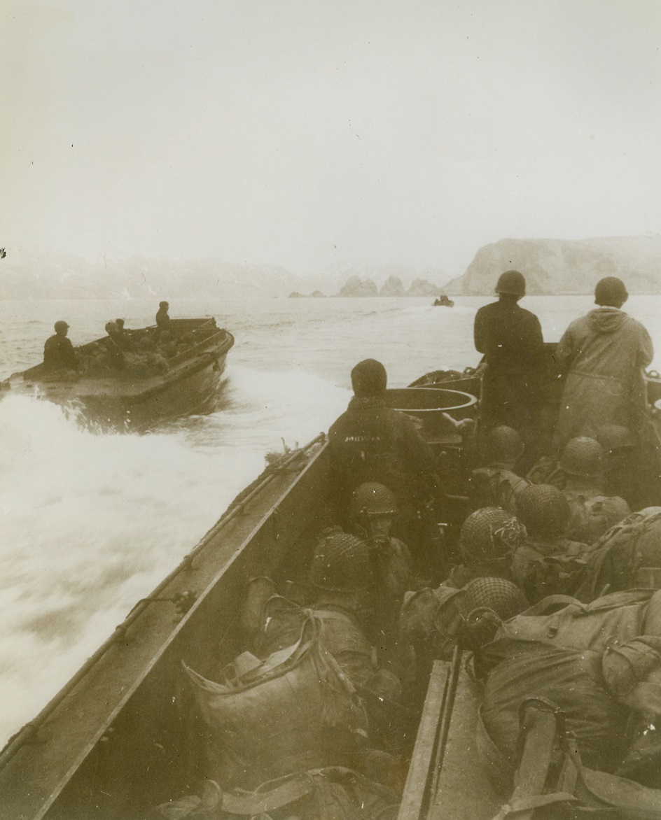 First Photos of Our Attack on Attu, 5/26/1943. As American troops landed on Attu, Aleutian islands, May 11, 1943, a Navy combat photography unit accompanied the first wave of American troops ashore at Japanese-occupied Attu, the Westernmost island of the Aleutian chain. This photo was made at the start of the attack and shows that landing boats having been put over the side of the transports are beginning to move towards the beach. The searchlight of the destroyer cuts thru the fog like a pencil.Credit Line (U.S. Navy official photo from ACME;