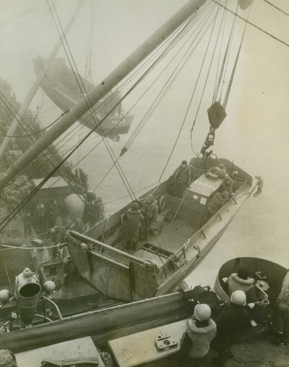 OVER THE SIDE INTO BATTLE, 5/271943. ATTU—Two landing boats are swung aloft from one of the ships that brought American troops to Attu to harass the Japs on that western-most island of the Aleutian chain. Filled with rarin’-to-go fighting men. Boats like these slid onto the shores of Massacre and Holtz Bays on Attu on May 11th, carrying the battle right of the Japs. Fierce hand-to-hand fighting is believed to be taking place on Attu at present, with the American hand uppermost. Credit: ACME.;