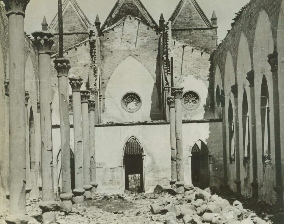 JAP SAVAGERY IN KIANGSI PROVINCE, 5/21/1943. From the camera of Vincentian priests, who served as missionaries in the Chinese Province of Kiangsi in October, 1942, when savage Jap troops visited the countryside to bring death and destruction to tiny towns that gave aid to General Jimmy Doolittle and his men, comes an eloquent record of the sufferings of the Chinese at the hands of brutal, vengeance-seeking Japan. Brought out of China by three priests and five American Sisters of Charity, who hid in the hills while the towns were laid waste, the pictures show violence that far surpasses damage done in modern bombing raids. The Chinese were tortured savagely and put to death en masse. Although the Japs had two objectives-the air field and 200 miles of railroad from Ying-tan to Chin-nua in Chekiang the general conduct of the rail was a punitive one, for it was here that American fliers were fed and treated after their raid of April 18, 1942. Fleeing China after the raid, the eight missionaries traveled on foot, by bus, and finally by boat and plane, reaching the Western Hemisphere five months later. The pictures were obtained in St. Louis from Father Paul Lloyd, director of the Vincentian Foreign Mission Society, and Father George Yager, the Vincentian priest who witnessed the raid and supplied captions for the following photos. Even the Chinese churches failed to escape demolition at the hands of raiding Jap troops. Here is a view of the rear of Ying-tan church after the Japanese laid waste the city. Credit: ACME;