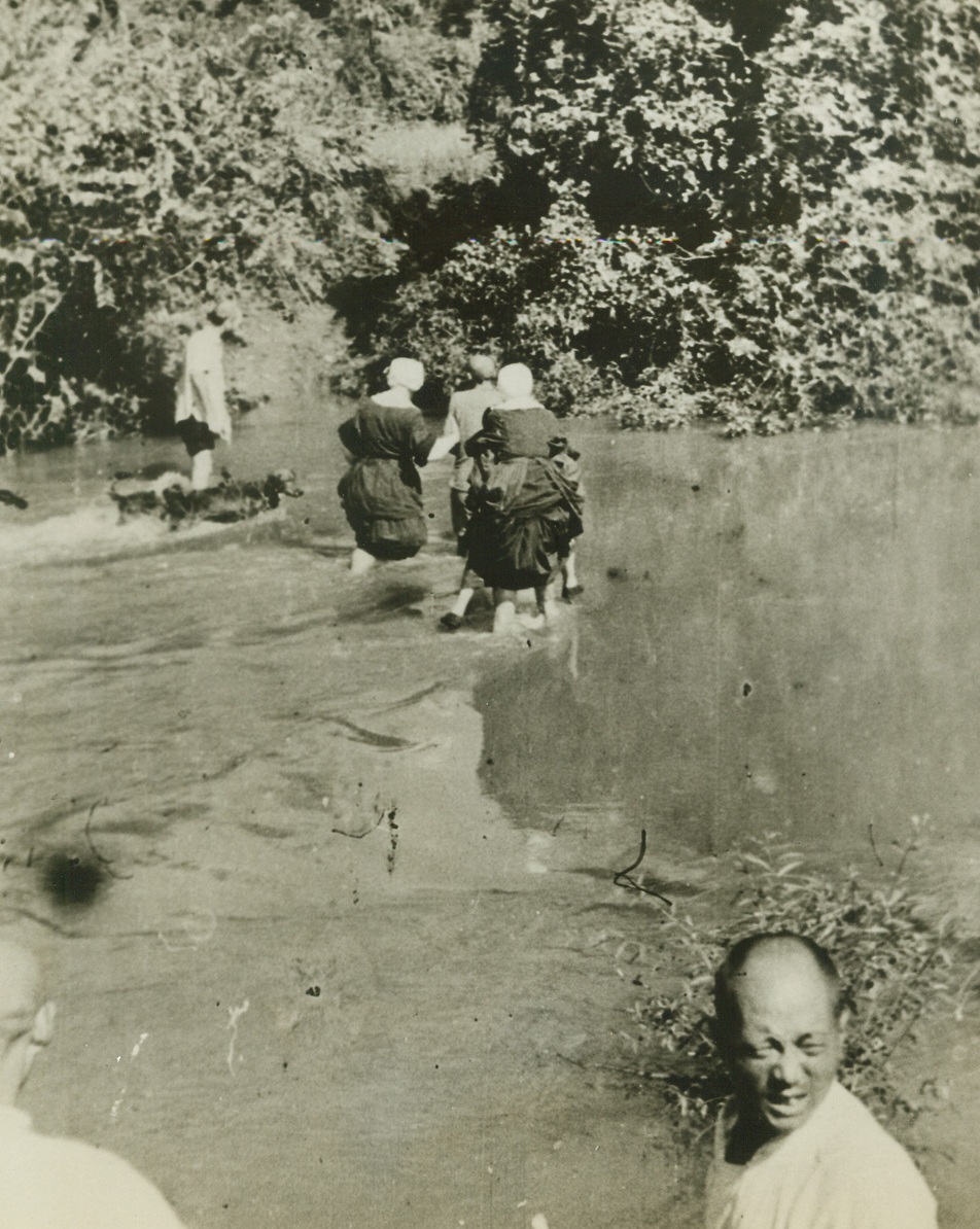 JAP SAVAGERY IN KIANGSI PROVINCE, 5/21/1943. From the camera of Vincentian priests, who served as missionaries in the Chinese Province of Kiangsi in October, 1942, when savage Jap troops visited the countryside to bring death and destruction to tiny towns that gave aid to General Jimmy Doolittle and his men, comes an eloquent record of the sufferings of the Chinese at the hands of brutal, vengeance-seeking Japan. Brought out of China by three priests and five American Sisters of Charity, who hid in the hills while the towns were laid waste, the pictures show violence that far surpasses damage done in modern bombing raids. The Chinese were tortured savagely and put to death en masse. Although the Japs had two objectives-the air field and 200 miles of railroad from Ying-tan to Chin-nua in Chekiang the general conduct of the rail was a punitive one, for it was here that American fliers were fed and treated after their raid of April 18, 1942. Fleeing China after the raid, the eight missionaries traveled on foot, by bus, and finally by boat and plane, reaching the Western Hemisphere five months later. The pictures were obtained in St. Louis from Father Paul Lloyd, director of the Vincentian Foreign Mission Society, and Father George Yager, the Vincentian priest who witnessed the raid and supplied captions for the following photos. Holding their skirts high, American Sisters of Charity splash through a mountain stream as they flee the fast-approaching Jap Army of destruction. The Sisters abandoned their traditional headdress for the flight, to prevent the large, white headpieces from attracting the attention of aircraft. Credit: ACME.;