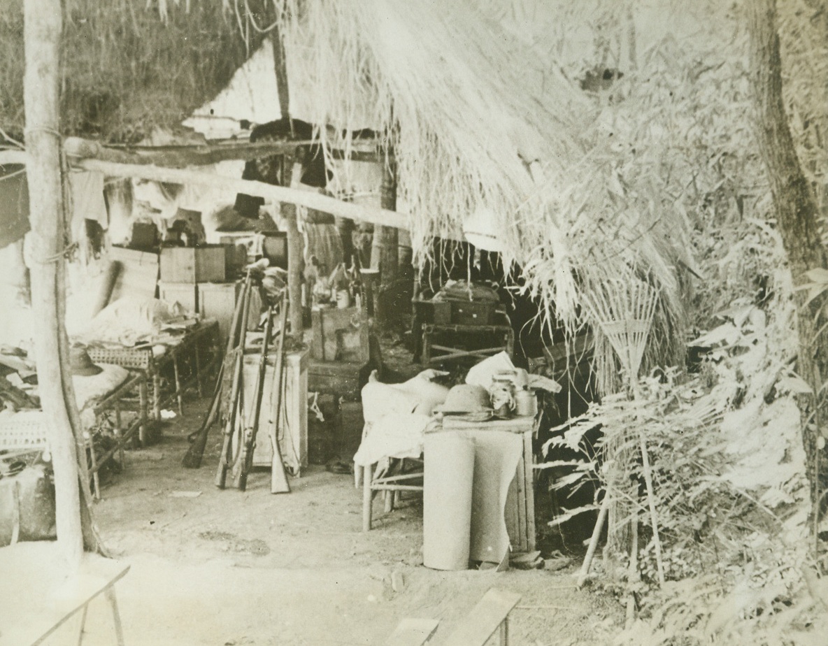 JAP SAVAGERY IN KIANGSI PROVINCE, 5/21/1943. From the camera of Vincentian priests, who served as missionaries in the Chinese Province of Kiangsi in October, 1942, when savage Jap troops visited the countryside to bring death and destruction to tiny towns that gave aid to General Jimmy Doolittle and his men, comes an eloquent record of the sufferings of the Chinese at the hands of brutal, vengeance-seeking Japan. Brought out of China by three priests and five American Sisters of Charity, who hid in the hills while the towns were laid waste, the pictures show violence that far surpasses damage done in modern bombing raids. The Chinese were tortured savagely and put to death en masse. Although the Japs had two objectives-the air field and 200 miles of railroad from Ying-tan to Chin-nua in Chekiang the general conduct of the rail was a punitive one, for it was here that American fliers were fed and treated after their raid of April 18, 1942. Fleeing China after the raid, the eight missionaries traveled on foot, by bus, and finally by boat and plane, reaching the Western Hemisphere five months later. The pictures were obtained in St. Louis from Father Paul Lloyd, director of the Vincentian Foreign Mission Society, and Father George Yager, the Vincentian priest who witnessed the raid and supplied captions for the following photos. This grass tent was the home of missionaries as they hid in the hills while savage Japs wrought havoc in Kiangsi towns below. Credit: ACME.;