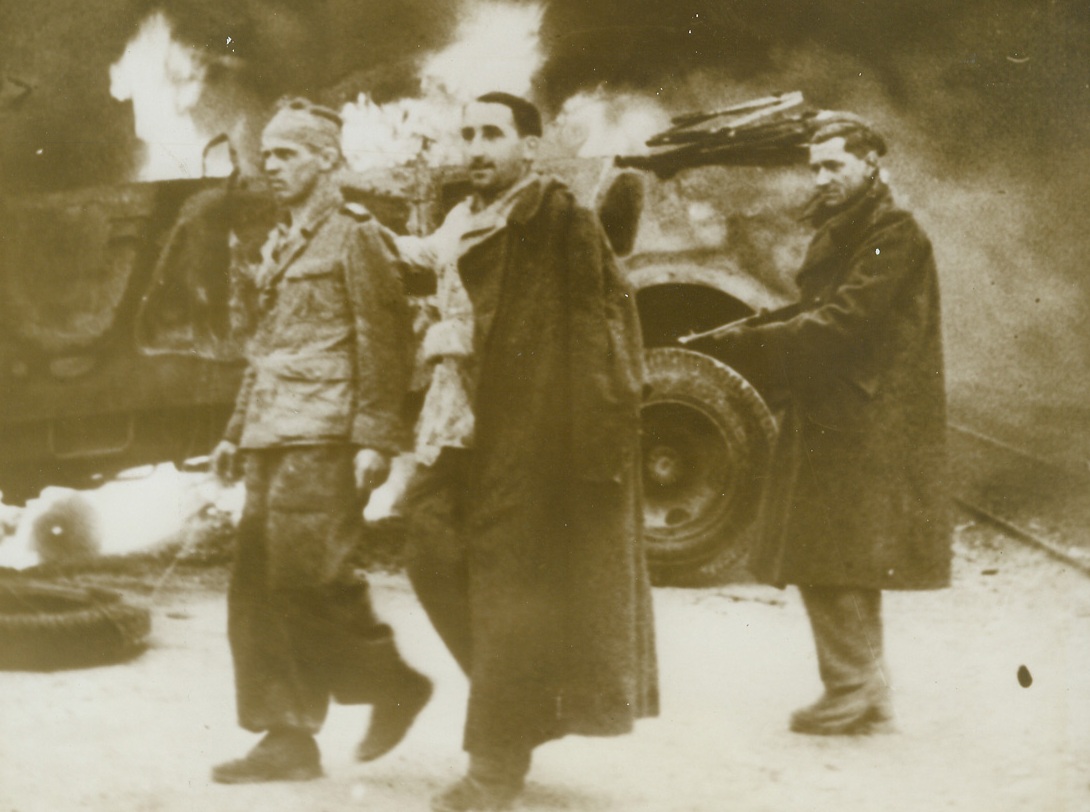 Allies Occupy Tunis, 5/19/1943. Tunis: – A British Tommy keeps his gun pointed at a pair of German prisoners whom he captured when Tunis fell to the allies. The trio march past a Nazi vehicle that is still burning. Credit line (ACME);