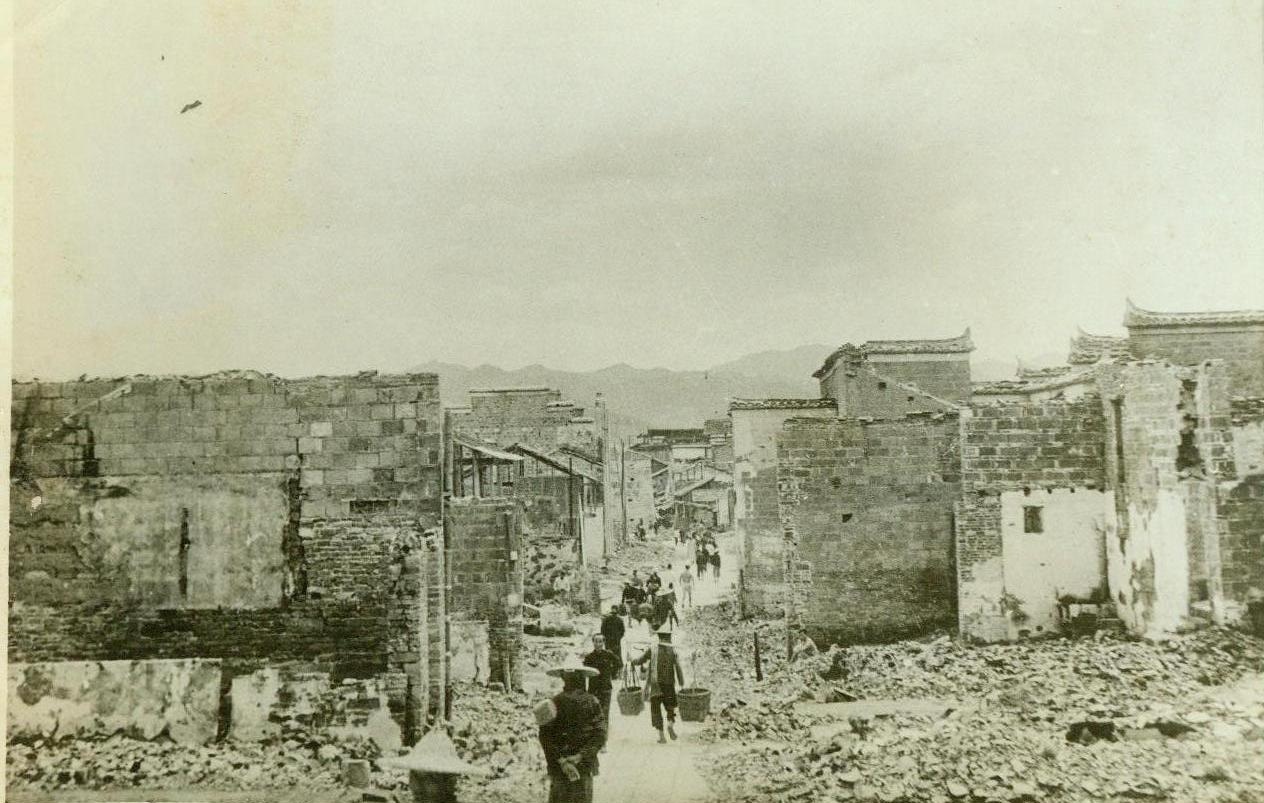 …Savagery in Kiangsi Province, 5/25/1943. From the camera of Vincentian priests, who served as missionaries in the Chinese province of Kiangsi in October, 1942, when savage Jap troops visited the countryside to bring death and destruction to tiny towns that gave aid to General Jimmy Doolittle and his men, comes an eloquent record of the suffering of the Chinese at the hands of brutal, vengeance-seeking Japan. Brought out of China by three priests and five American sisters of charity, who hid in the hills while the towns were laid waste, the pictures show violence that far surpasses damage done in modern bombing raids. The Chinese were tortured savagely and put to death en masse. Although the Japs had two objectives – the air field and 200 miles of railroad from Ying-Tan to Chin-Hua in Chekiang – the general conduct of the raid was a punitive one, for it was here that American fliers were fed and treated after their raid of April 18, 1942. Fleeing China after the raid, the eight missionaries traveled on foot, by bus, and finally by boat and plane, reaching the western hemisphere five months later. The pictures were obtained in St. Louis from Father Paul Lloyd, director of the Vincentian Foreign Mission Society, and Father George Yager, the Vincentian priest who witnessed the raid and supplied captions for the following photos. … Not bombed, but burned and torn down by Japanese Infantry, the city of Ying-Tan lays in ruins. A line of Chinese peasants moves slowly between the rows of wrecked buildings as relief work is begun after the raid.;