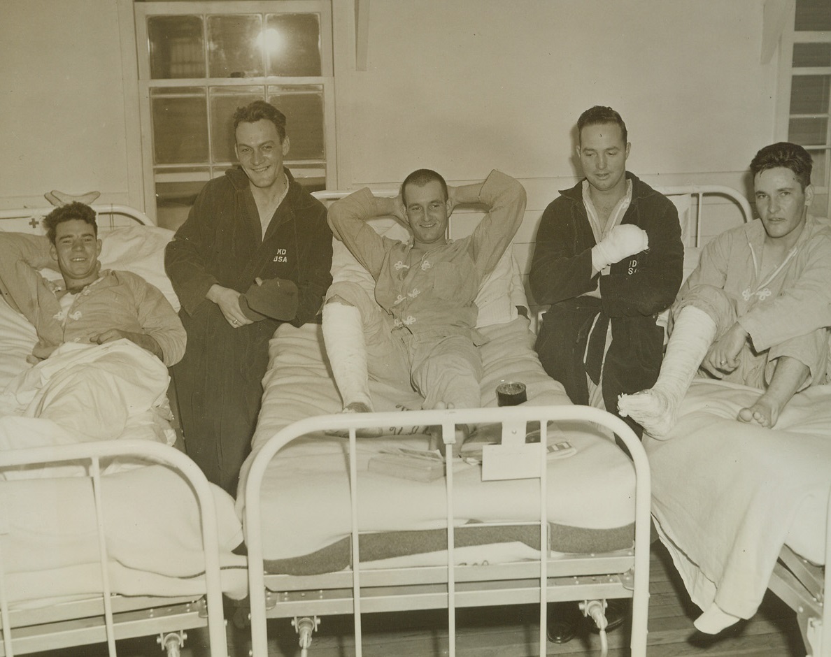 Back Ahead of Schedule, 5/30/1943, Seattle, Washington — These boys fought on Attu, but their wounds brought them back to the states before the death knell for Jap forces there had been sounded. Recuperating at an army hospital and impatient for the day when they’ll get another crack at the Nip are: (left to right) Pvt. John E. Terknett of Eastland, Texas; Pvt. Joseph E. Kenski of Detroit, Michigan; Pvt. James A. Meredity of Springfield, Illinois; Pvt. Woodrow W. French of Greenwood, Mississippi; and Sgt. Forrest W. Johnson of Flatriver, Missouri. Passed by censor. Credit: ACME;