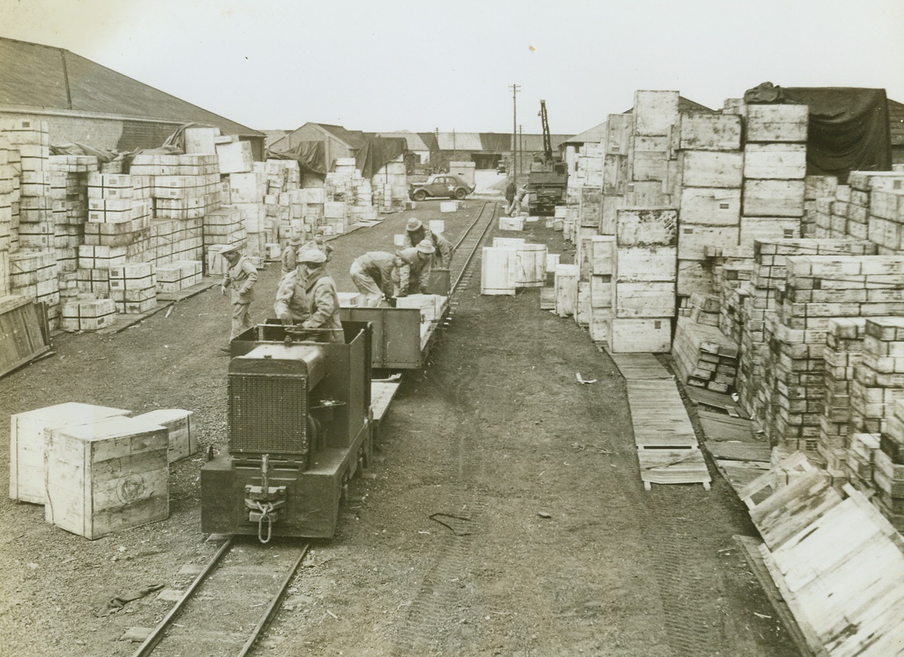 American Railroad in England, 5/22/1943. Somewhere in England — American soldiers stack crates of supplies on a car that runs along the only U.S.-built and operated railroad in England. Covering 17 miles of trackage, the railroad was built by the Army to haul supplies from the British unloading point to the warehouses, or from U.S. warehouses to British lines for shipment. Credit: ACME;