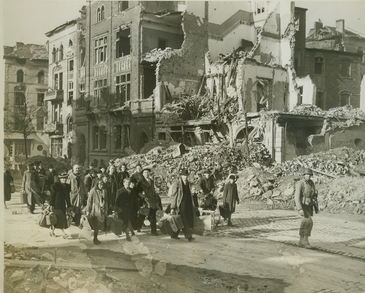 Leaving a Sinking Ship, 10/20/1944. Aachen, Germany – Carrying a minimum of baggage, German civilians leave their cellar hideouts in Aachen and head for safer areas, led by an American soldier. Supreme Allied Headquarters announced today that the last enemy resistance had been mopped-up, and the city is in the hands of the American First Army – the first great German city to fall to the Allies. Credit (ACME photo by Bert Brandt, War Pool Correspondent);