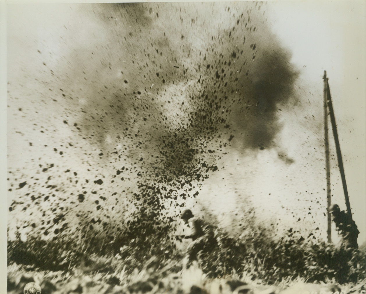 Yanks Barge Through Shell Burst, 10/13/1944. Holland – American paratroopers bend low but continue their advance on Arnhem as a bursting German 88 kicks up a section of field. Credit (Signal Corps Photo from ACME);