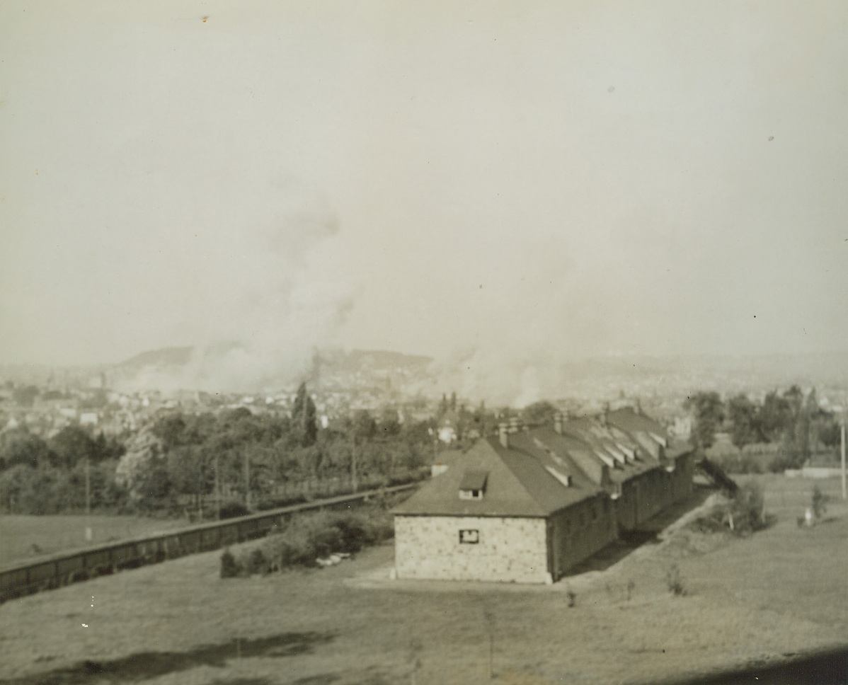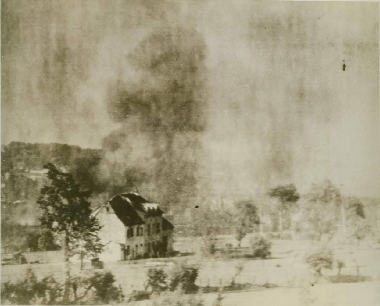 Air War Over Aachen, 10/13/1944. AACHEN, GERMANY – Buildings in Aachen go up in smoke and flames as P-38’s and P-47’s give the German town the once over after the garrison there refused to surrender. Today the Allies were in the outskirts and fighting steadily inward. Credit (Signal Corps Radiotelephoto from ACME);