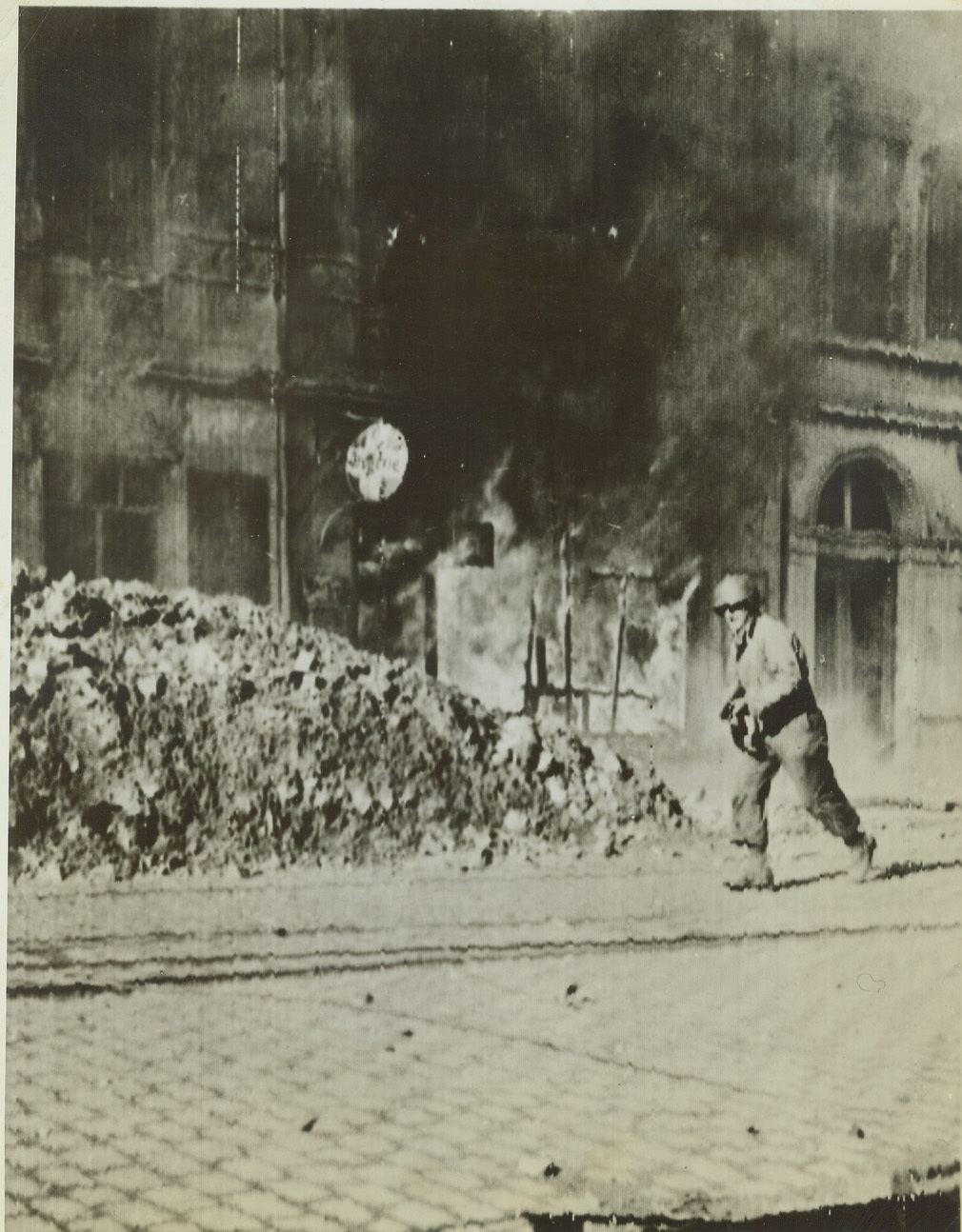 Inching Ahead in Aachen, 10/16/1944. AACHEN, GERMANY – Running past a blazing building, an American Infantryman advances through the streets of embattled Aachen. Credit: (Army Radiotelephoto from ACME);