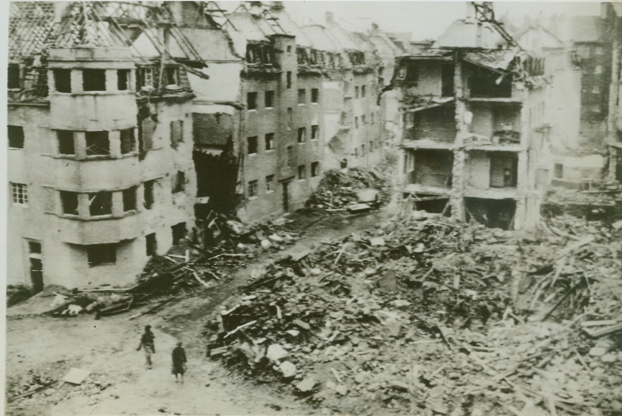 Blasted Aachen, 10/18/1944. Huge piles of rubble fill this street in battle-smashed Aachen, Germany. Many historic buildings were leveled in the heavy shelling and aerial bombardment which preceded Yank entry. Credit: (ACME);