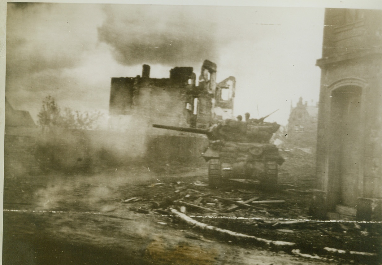 U.S. Tanks Roll into Aachen, 10/14/1944. GERMANY – Guns pointed toward enemy positions American tanks roll deeper into Aachen past bomb-gutted buildings.Credit (Army Radiotelephoto from Acme);