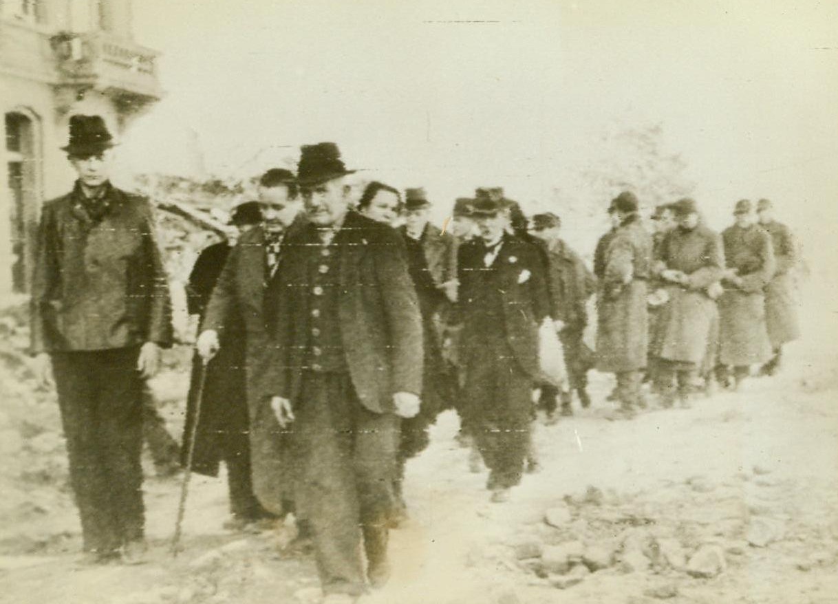Exit From Aachen, 10/16/1944. Aachen, Germany – German civilians and Nazi soldiers captured by the Yanks are led away from the fighting area during the battle for Aachen. The civilians took refuge in their cellars as war reached their doorsteps. 10/16/44 (ACME);