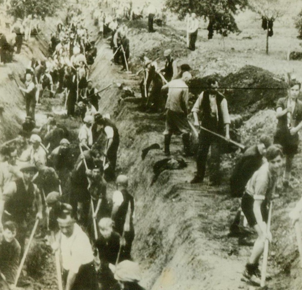Traps For Allied Tanks, 10/16/1944. Moselle River Area, Germany – According to the caption accompanying this photo, radioed today from Stockholm, the picture shows a great gang, boys and men alike, of German civilians digging long tank traps in the Moselle River area. German caption states that it is “protection of “periphery” of Reich.” 10/16/44 (ACME);