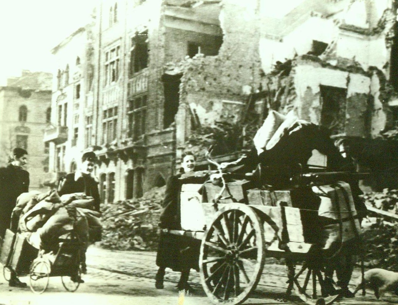 Refugees Flee Aachen, 10/16/1944. Aachen, German – Pushing carts piled high with their few salvaged belongings, German women flee doomed Aachen. The refugees pass through a ruined street, walking past shell and bomb-torn buildings. 10/16/44 (ACME);