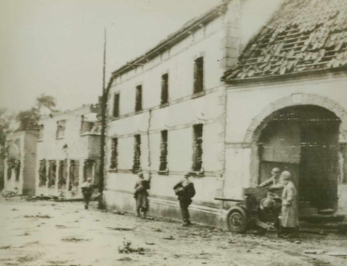 Nazi Hunt, 10/5/1944. While a crew of their buddies stands ready with an anti-tank gun, an American patrol advances slowly down the street in this German town, looking for Nazi sniper nests and traps. Credit: Army radiotelephoto from ACME.;