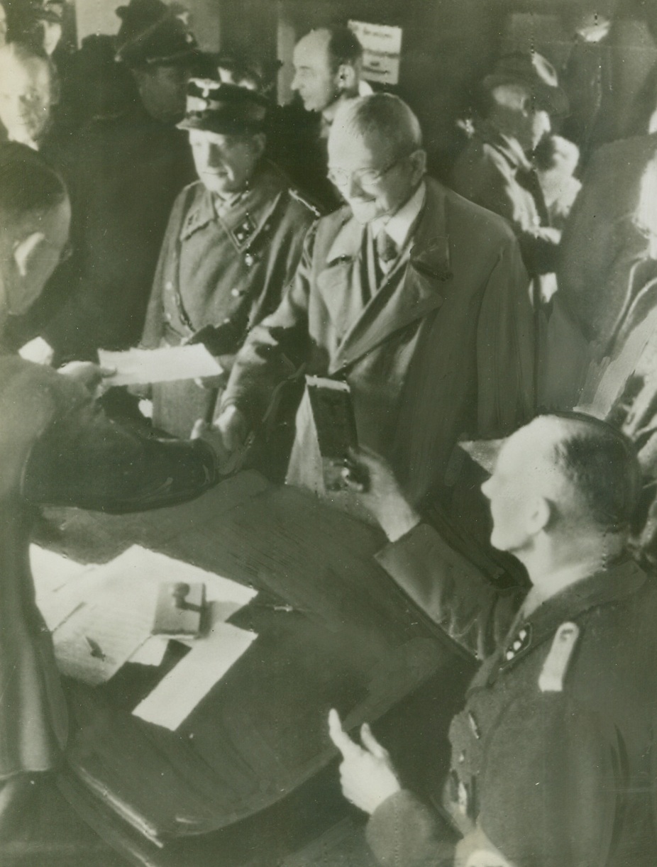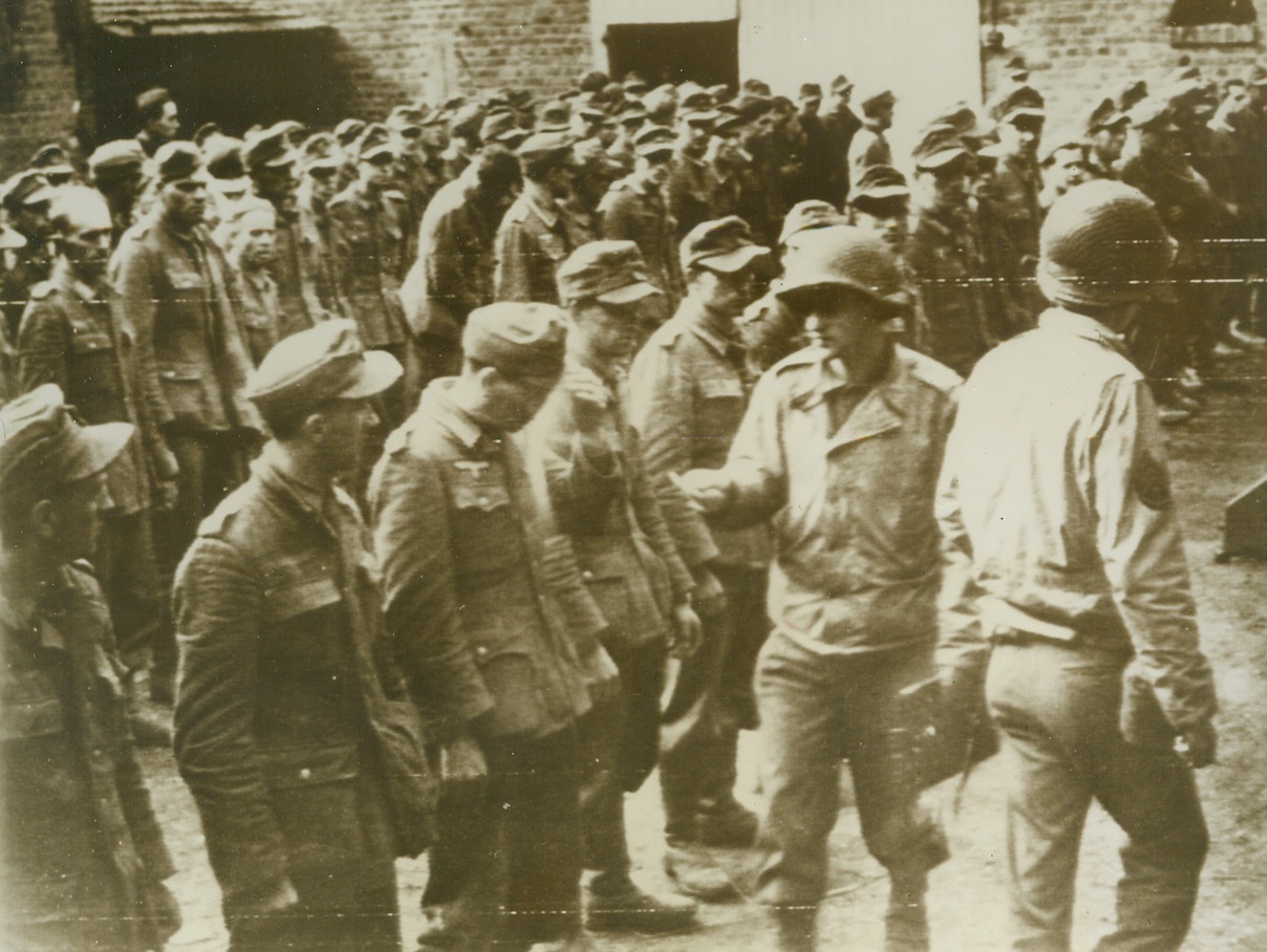 Captured in Siegfried Breakthrough, 10/5/1944. An American officer checks the first large group of Nazi prisoners captured by the Yanks, after their breakthrough of the Siegeried line at Uebach, Oct. 4. Credit: ARMY RADIOTELEPHOTO from ACME.;