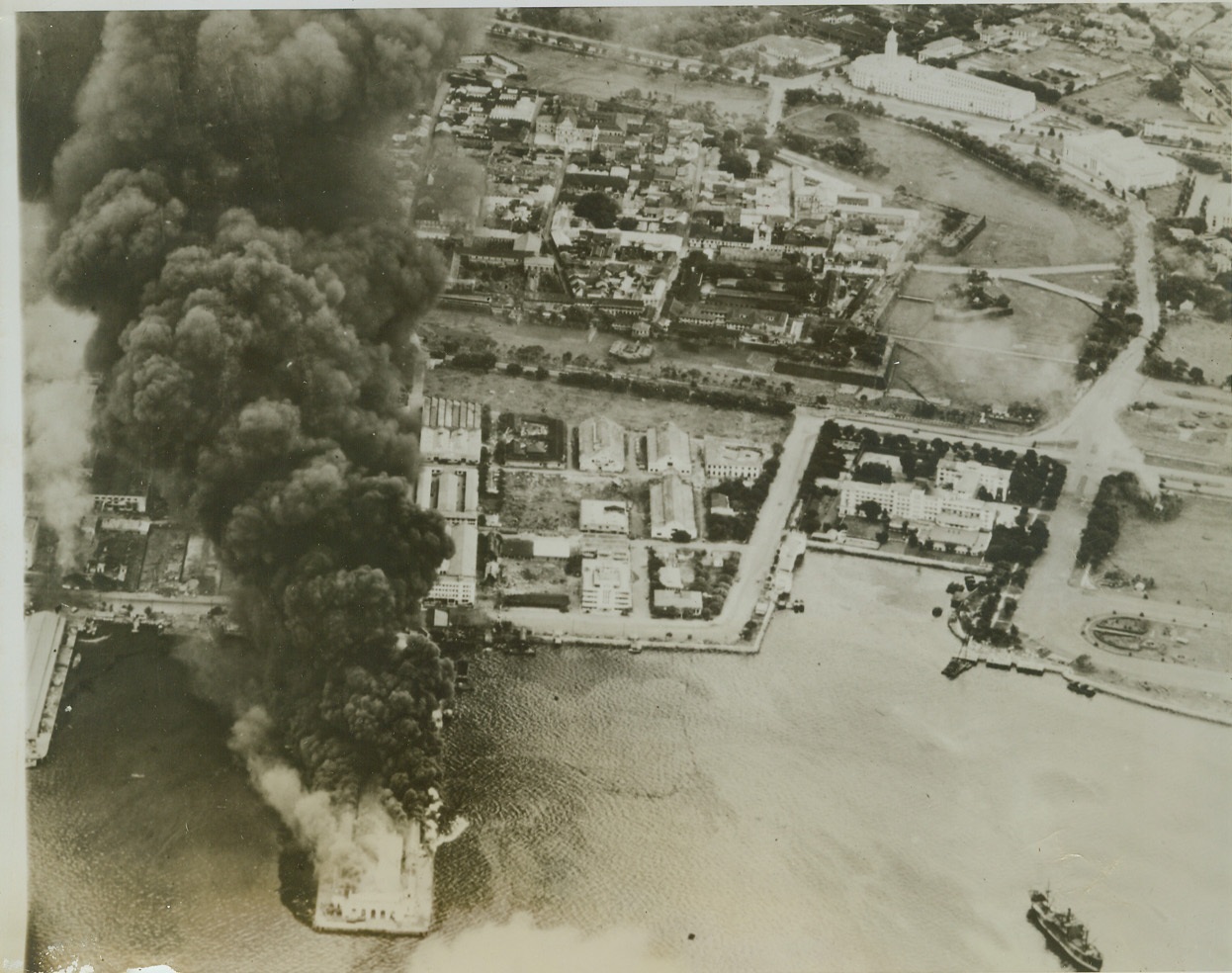 Yanks Uninvited Guests at Manila, 10/8/1944. MANILA — Planes from V/Adm. Marc A. Mitscher’s carrier task force paid a surprise visit to Manila and left calling cards in the form of these blazing docks. In the right foreground can be seen the swank Manila Hotel, with its gardens and yacht harbor. Municipal buildings, built by Filipinos before the Japs invaded the island, can be seen untouched in the background. Credit (Official US Navy Photo From ACME);
