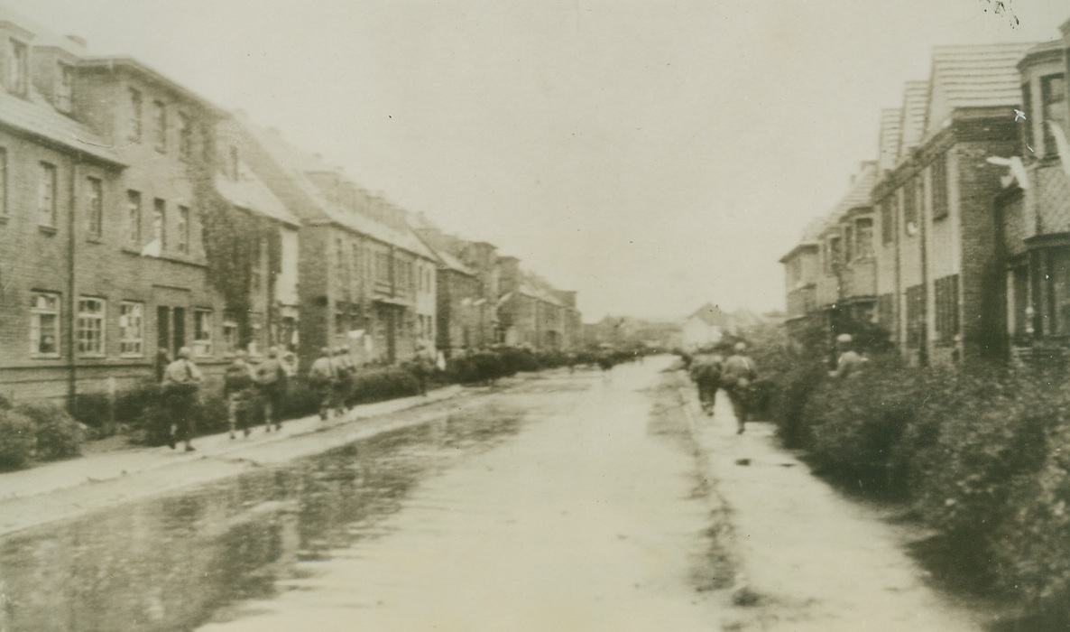 “LAUNDRY SALUTE”, 10/19/1944. GERMANY—Bits of sheets and other white cloth hang from houses on both sides of the street in this town beyond Kohlscheid, in token of surrender as U.S. Infantrymen advance through the rain in search of the enemy.Credit: Army Radiotelephoto from Acme;