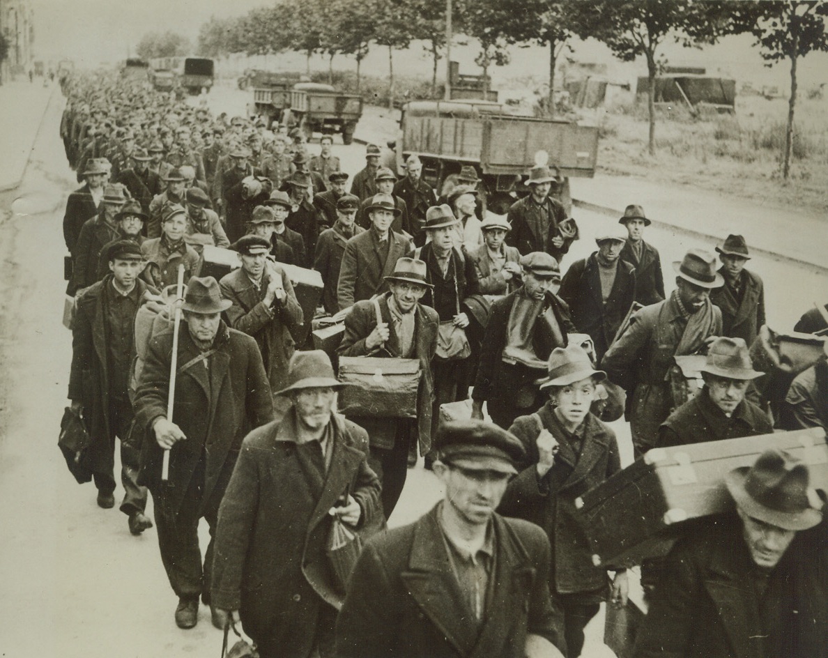 GERMAN PRISONERS LEAVE FRANCE, 10/4/1944. Rounded up on the Western Front, these Germans are shown on their way to prisoner of war camps in England. They were members of civilian groups working on fortifications and in other types of labor battalions. Credit: Army Radiotelephoto from Acme;