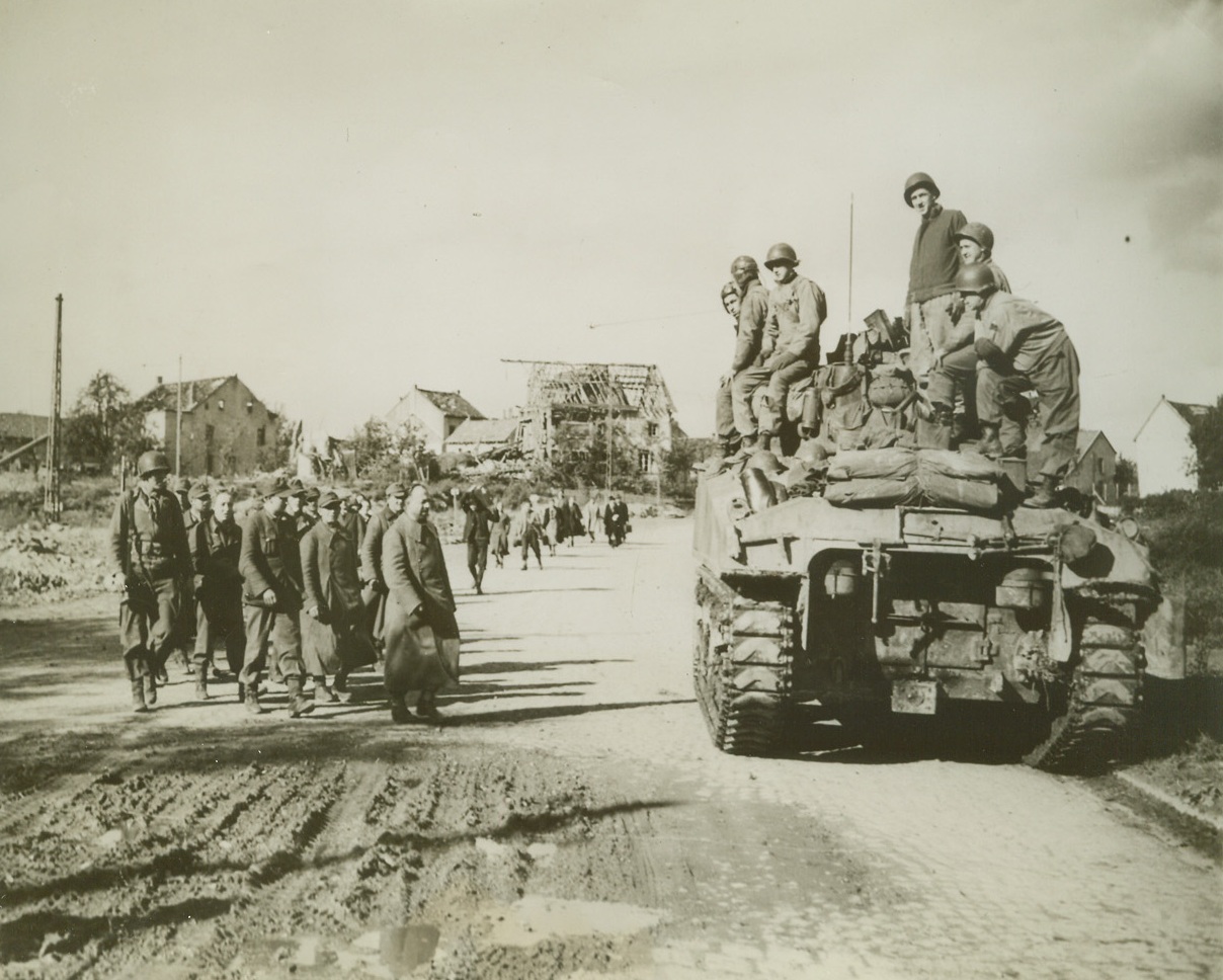 They Quit Aachen Battle, 10/18/1944. Guarded by an American Infantryman, a long line of Germans surrenders to the crew of a U.S. 1st Army tank in the battered city of Aachen, Germany. Credit: (ACME) (WP);